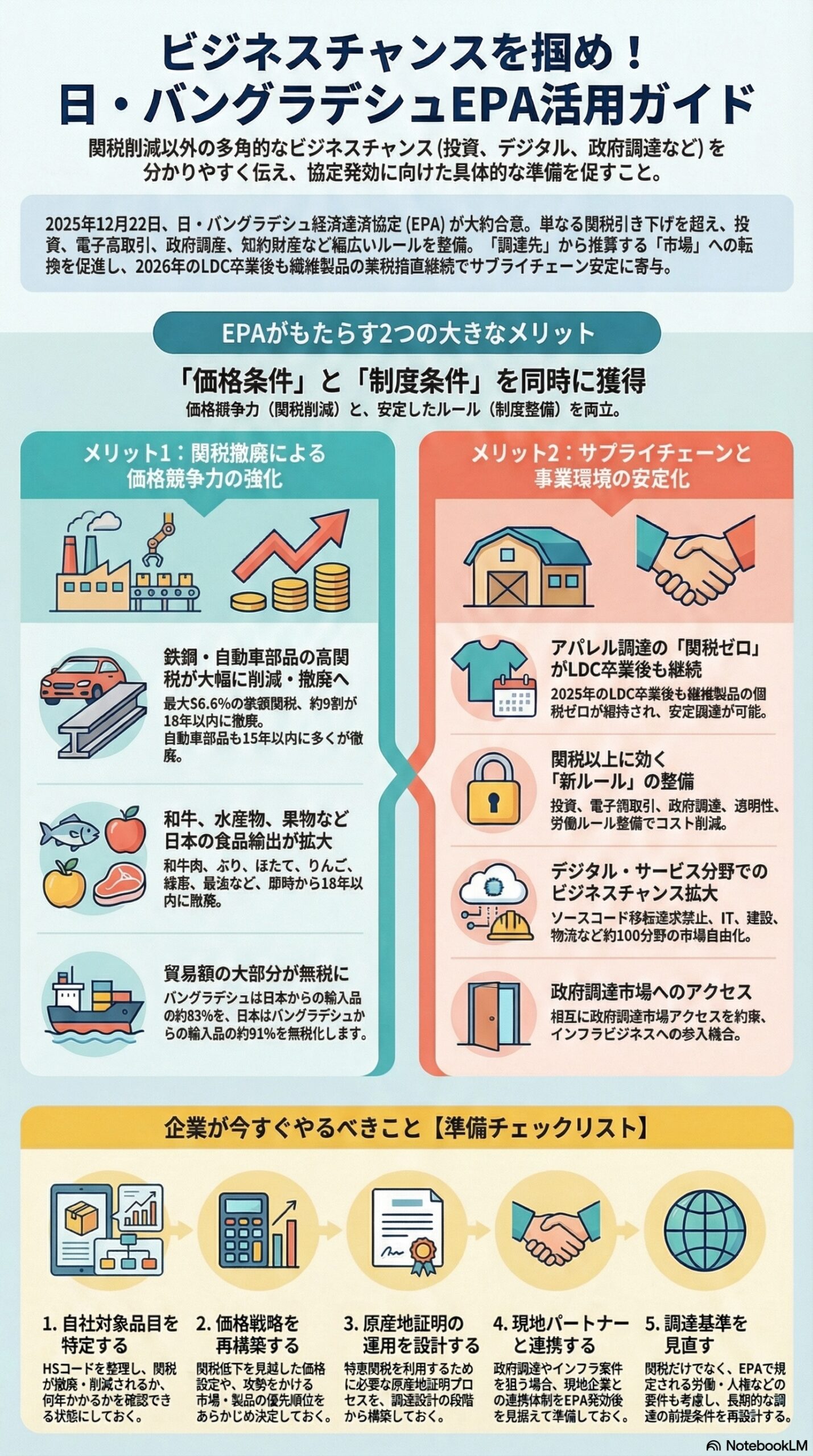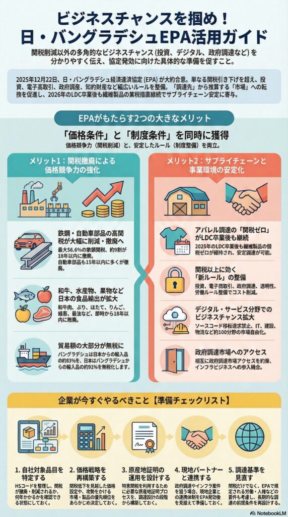 今回のEPAは、日本企業にとって「バングラデシュ市場で勝つための価格条件」と「現地で動くための制度条件」を同時に取りにいった合意