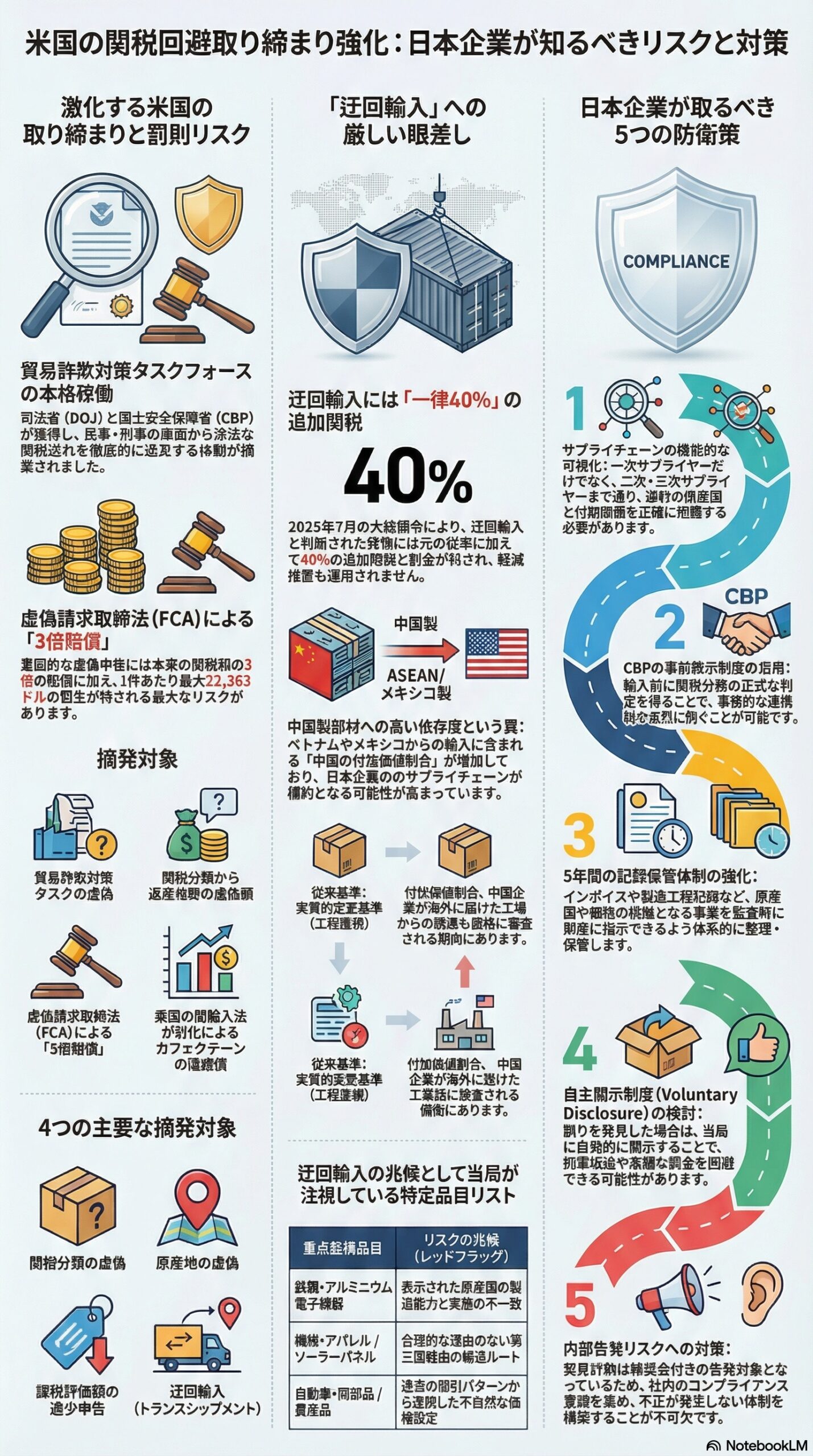 2026年に入り、トランプ米政権による関税回避の取り締まりが大幅に強化されています。2025年8月に設立された省庁横断の「貿易詐欺対策タスクフォース」は、原産国の虚偽申告や迂回輸入など違法な関税逃れに対して、民事・刑事両方の罰則を科す姿勢を明確にしています。日本企業にとって、この取り締まり強化は対米ビジネスにおける新たなコンプライアンスリスクとなっており、適切な理解と対応が急務となっています。strtrade+1
