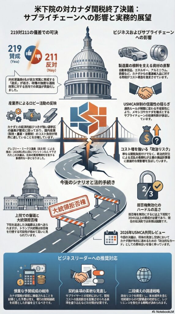 2026年2月11日、ワシントンD.C.において北米の貿易環境を左右する重要な政治的決断が下されました。米国下院は、トランプ大統領がカナダに対して課している追加関税を終了させるための共同決議案を、賛成219、反対211の僅差で可決しました。