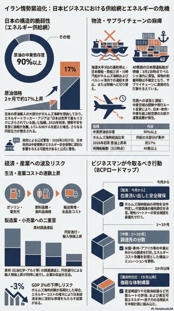 今回の事態は、日本が長年抱えてきたエネルギーと物流の「中東依存」という構造的脆弱性を一挙に顕在化させました。短期的な対処にとどまらず、この機会をサプライチェーン全体の強靭化を進める転換点として捉えることが、経営者・ビジネスマンに求められています。[news.yahoo.co]