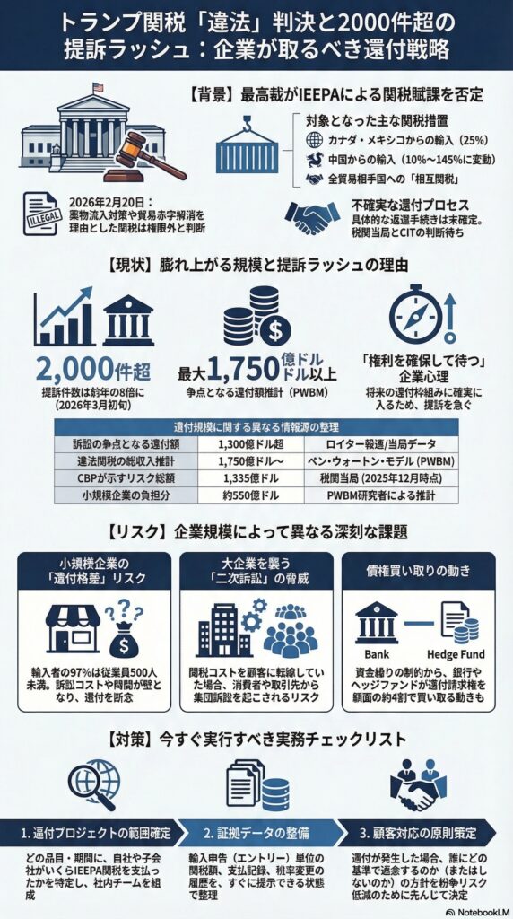 企業側は、回収と並行して、価格条項、サプライチェーン、在庫回転、調達先分散の意思決定を「関税変動がまた起きる前提」で見直す必要があります。