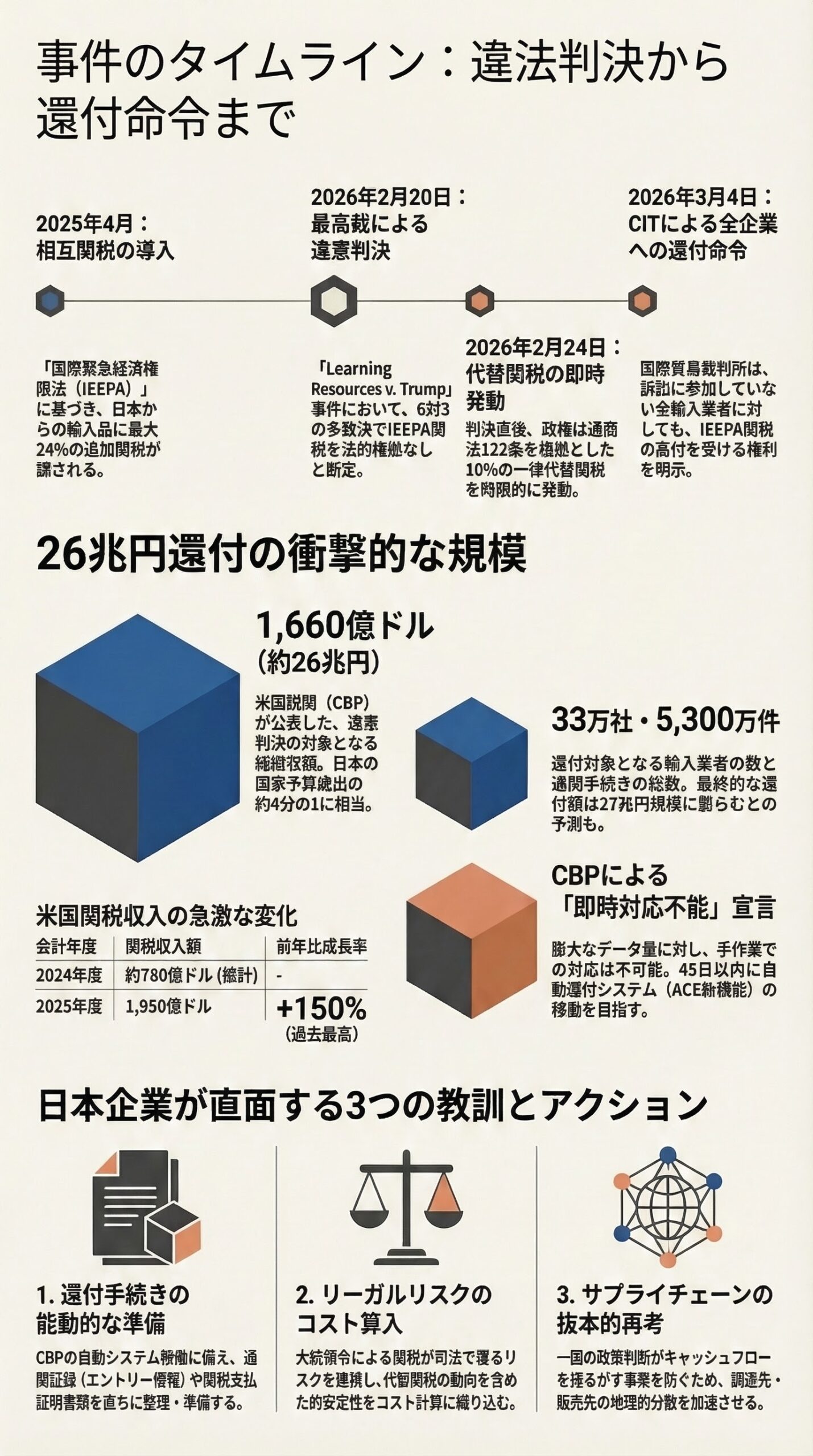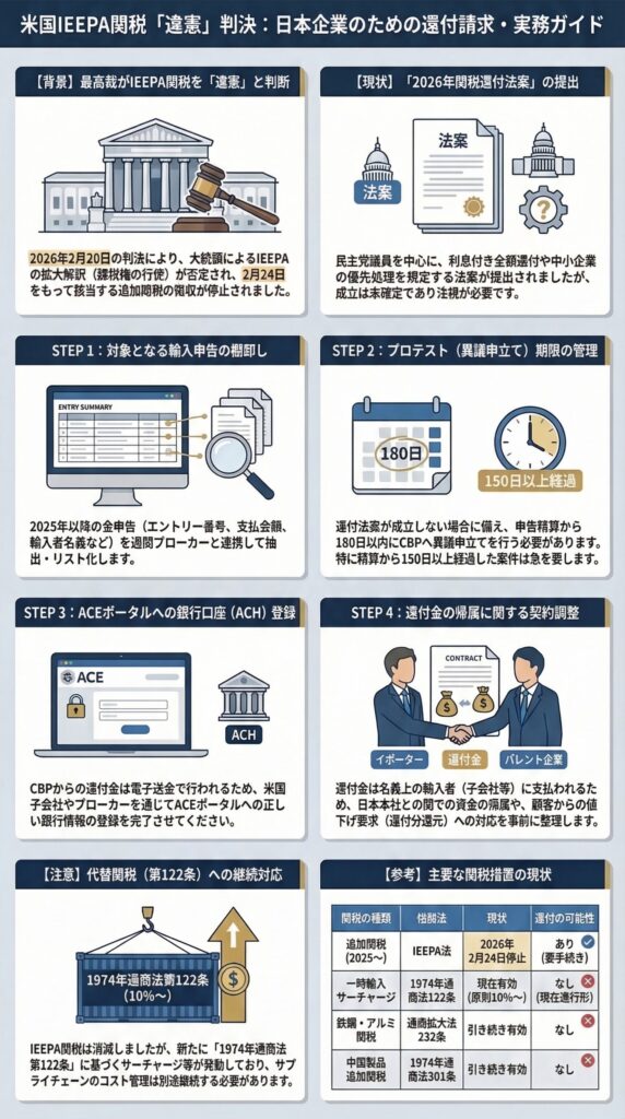 本記事は、米国連邦最高裁判所判決・ホワイトハウス大統領令・CBP公式通知・米上院財政委員会の発表・EY Japan・PwC Japan・JETROなどの公開情報に基づき、2026年3月9日時点での一般的な情報提供を目的として作成したものです。本記事は法務・税務・会計・通関に関する専門的な助言を構成するものではなく、特定の企業・取引・申告状況に対する個別の見解を示すものでもありません。関税の還付・申告・精算に関する実務は、品目分類・原産地認定・取引条件・申告状況・精算状況・契約内容などにより個別に大きく異なります。本記事の内容は、法案の審議・成立状況やCBPの運用変更・大統領令の改廃などによって随時変化する可能性があります。実際の対応にあたっては、最新のCBP公式通知・大統領令・法案の動向を必ず確認のうえ、通関業者・通商弁護士・税理士・公認会計士などの有資格専門家に相談されることを強くお勧めします。本記事の内容に基づいて行われた判断・行動により生じたいかなる損害についても、作成者は一切の責任を負いかねます。