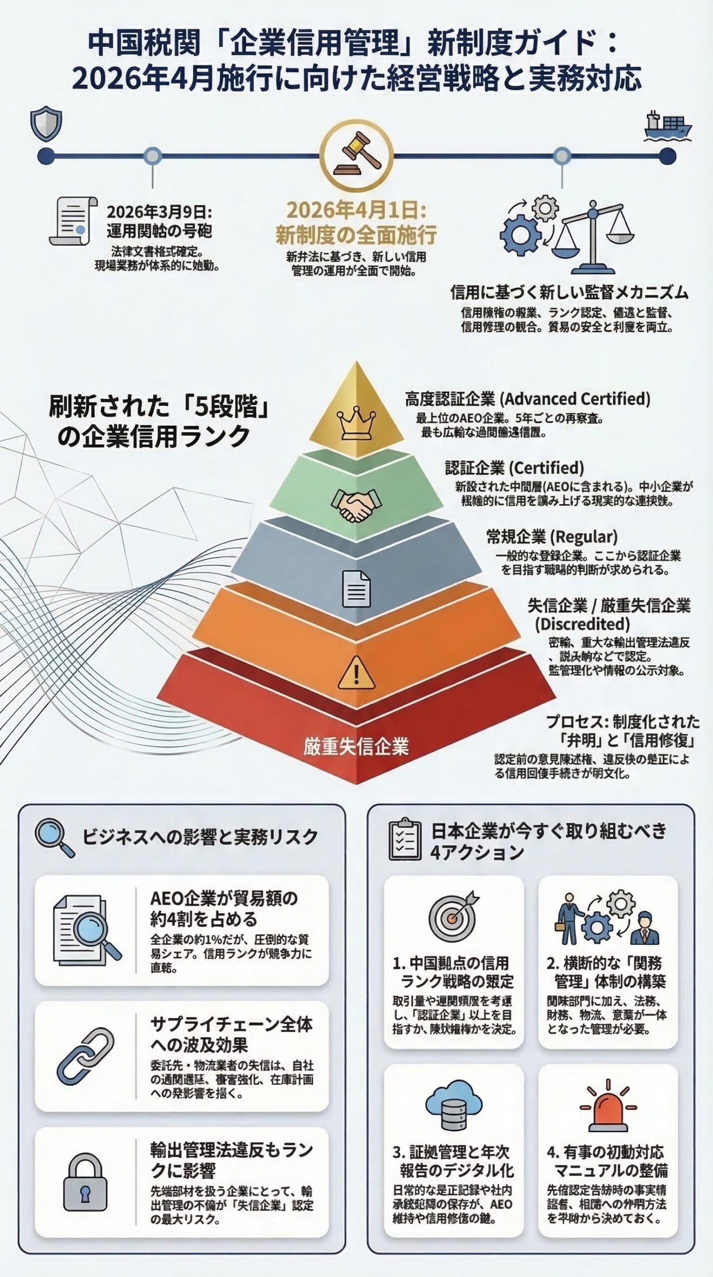 今回よく誤解されやすいのは、2026年3月9日に新制度そのものが告示された、という理解です。正確には、制度本体は2026年1月13日に公布されており、3月9日はその施行に向けて法律文書の様式を整備した公告です。税関総署は、この3月9日の公告について、信用管理弁法を全面的かつ有効に実施するためのものだと説明しています。