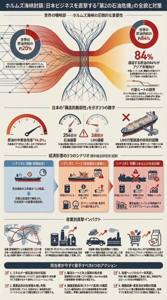 本稿発行の現在(2026年3月12日)、この状況は解消されていない。ホルムズ海峡の封鎖は「中東のローカルな紛争」ではなく、世界の製造業・物流・エネルギー産業すべてを揺るがす経済的震災に等しい。日本企業の経営者・担当者がいま最優先で把握すべき情報を、この一本の記事に集約する。
