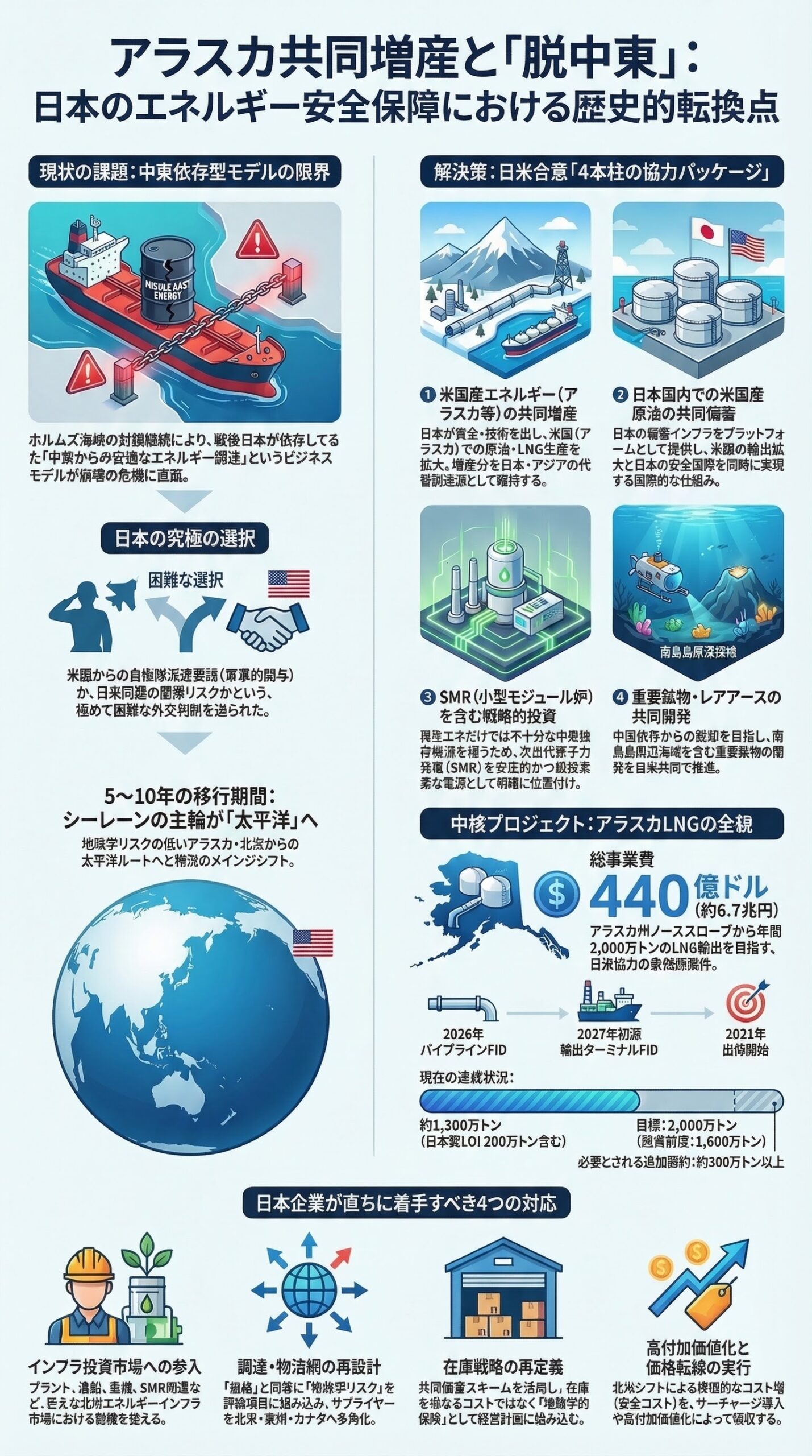 ただし、重要な留意点があります。アラスカLNGの出荷開始は早くとも2031年、原油増産・共同備蓄の実現にも数年単位の時間が必要です。「脱中東」は即座に実現するものではなく、5〜10年単位の移行プロセスとして捉える必要があります。その間はホルムズ海峡リスクと北米シフトコストの双方を並行管理しなければなりません。
