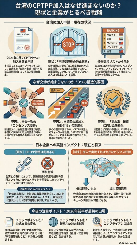 2025年末時点で台湾はCPTPPに未加入であり、日本と台湾の取引にCPTPP特恵(関税削減、域内累積原産など)を前提とすることはできません。ds-b+1