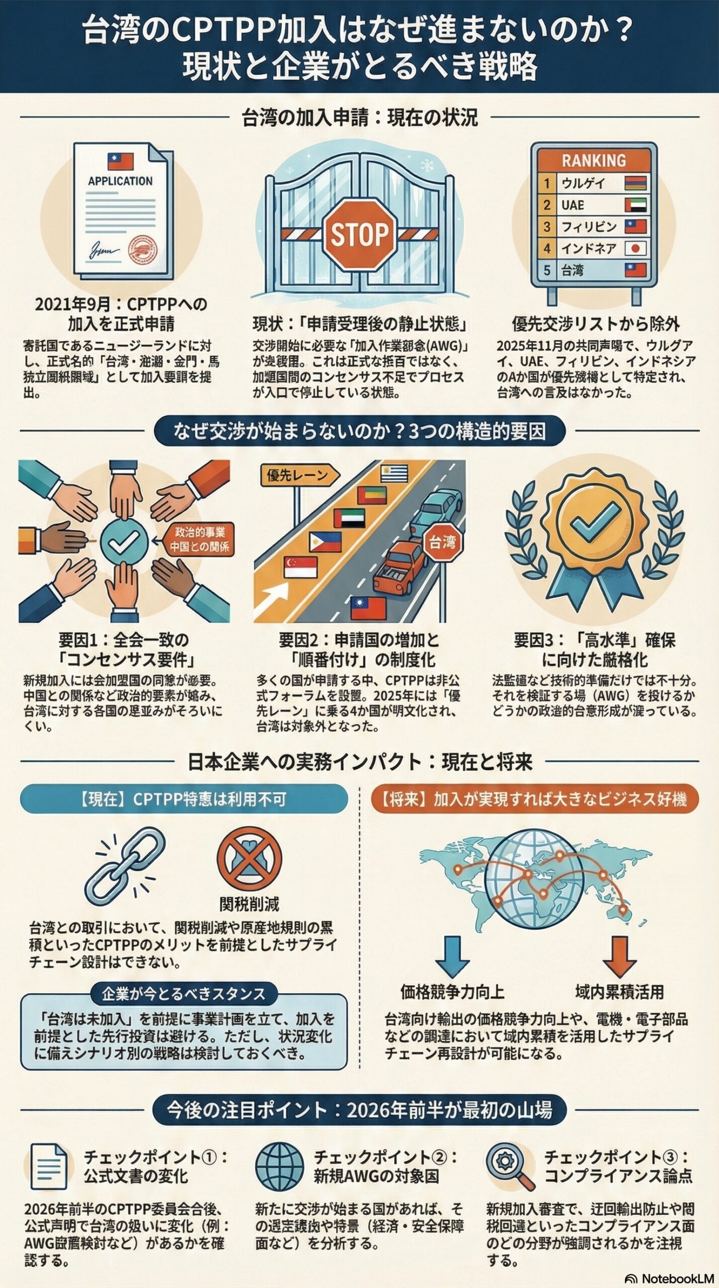 しかし2025年末時点で、台湾向けの「加入作業部会(Accession Working Group:AWG)」を設置するとの公式決定は確認できておらず、加入プロセスは“申請受理後の静止状態”にとどまっています。liskul+1