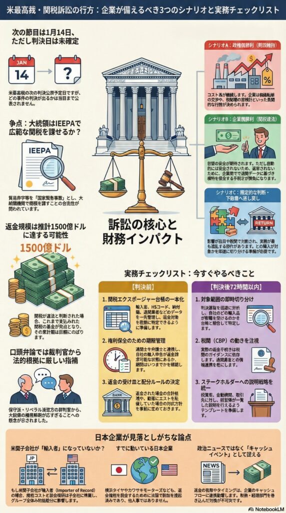 上の表で重要なのは、シナリオBでも「自動で返金される」と決め打ちしないことです。CITは返金を命じる権限を確認済みですが、実際の手続き、タイミング、配分ルールは最終的な判決内容とCBPガイダンスに依存します。scotusblog+3