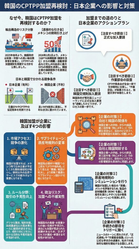 韓国のCPTPP加盟検討は、単なる通商ニュースではなく、企業の競争条件と供給網設計に直結するテーマです。 とくにメキシコの関税政策のように、協定ネットワークの差がそのままコスト差となる局面では、韓国の動きが加速するほど市場前提が変わっていきます。koreajoongangdaily.joins+3