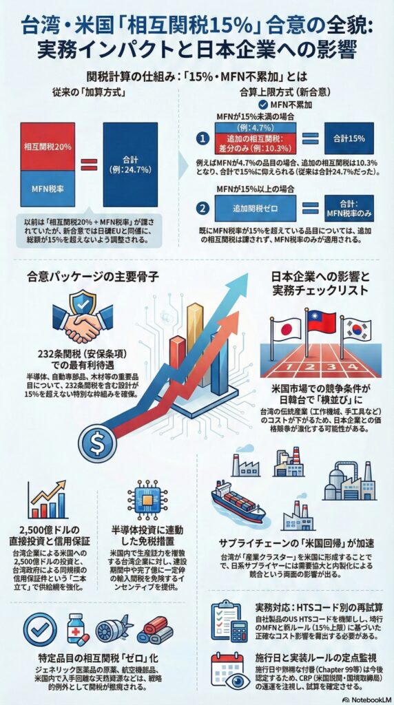 ポイントは「15%が上乗せされない」という点です。台湾行政院は、15%かつMFN不累加の計算方式は日韓EUと同じだと説明しています。 (ey.gov.tw)