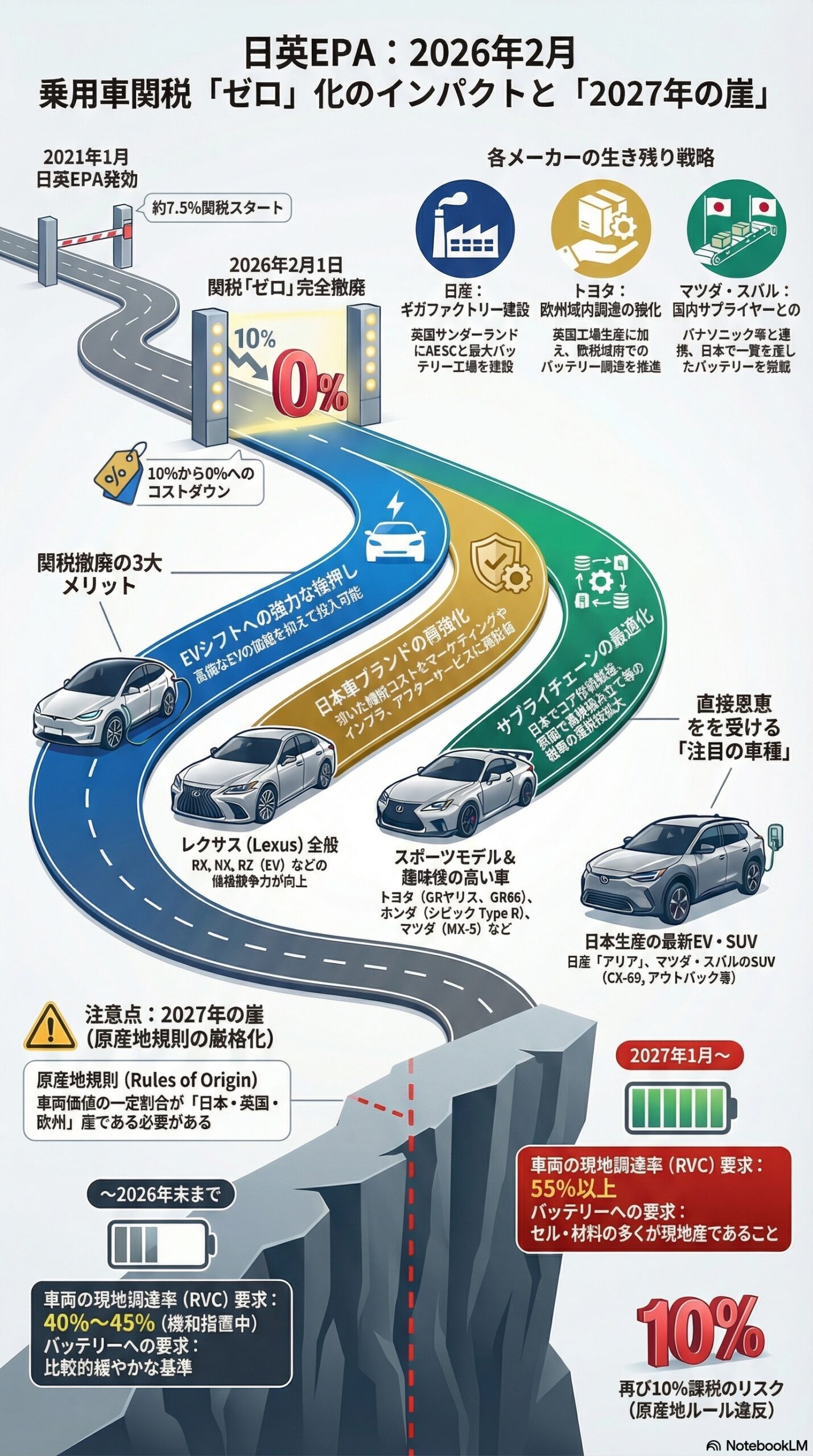 2026年2月の関税撤廃は、日本車にとっての**「輸出の春」です。しかし、その直後に控える2027年の原産地規則厳格化は、「バッテリーの自給自足」**を迫る厳しい試練でもあります。
