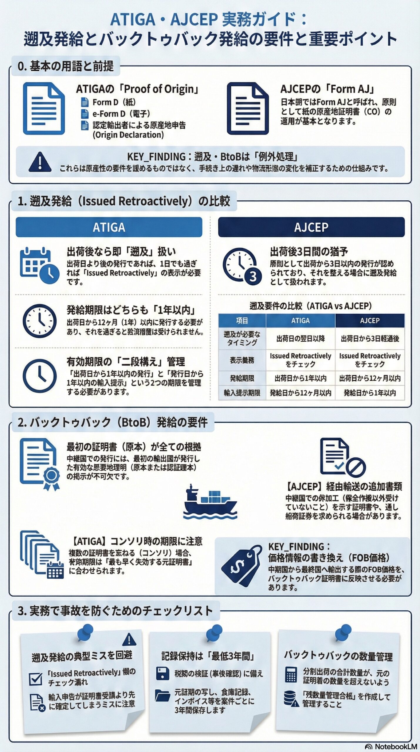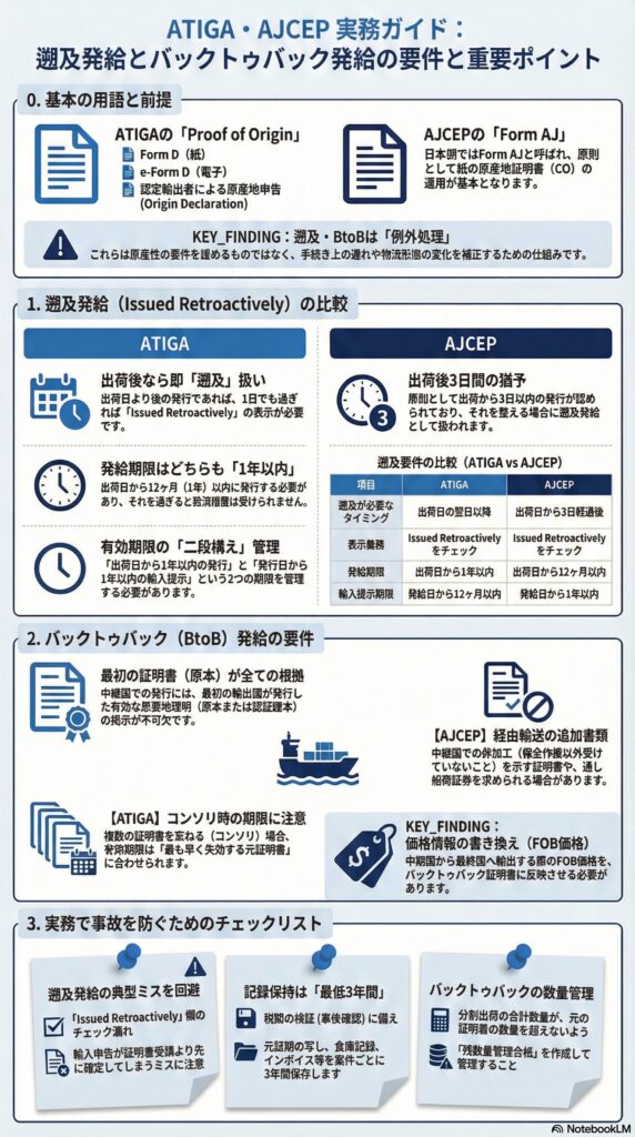 本稿では、ASEAN域内のATIGAと、ASEANと日本のAJCEPについて、遡及発給とバックトゥバック発給の要件を条文ベースで整理し、ビジネス担当者が運用設計できるところまで掘り下げます。国別の細かな申請手続は発給当局ごとに異なるため、最後に運用の考え方とチェックポイントもまとめます。