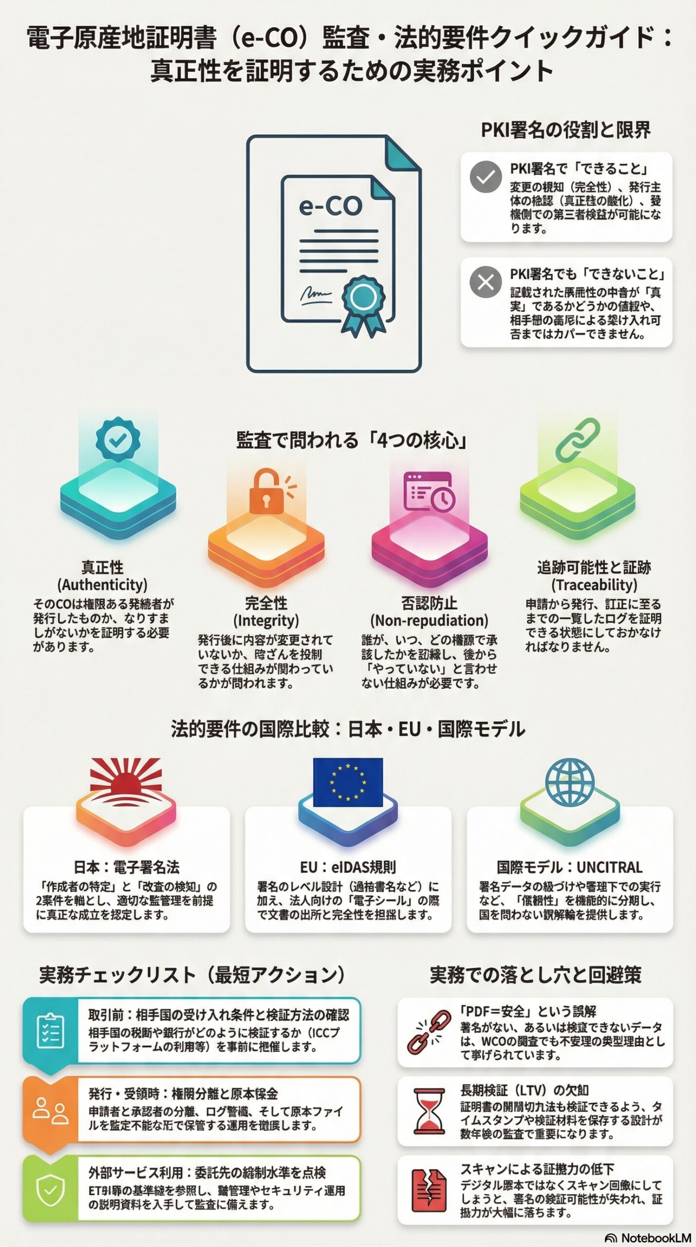 電子COの実務で問われるのは、原産性だけではなく、文書の真正性と完全性を検証できること、そして説明可能な監査証跡が残っていることです。