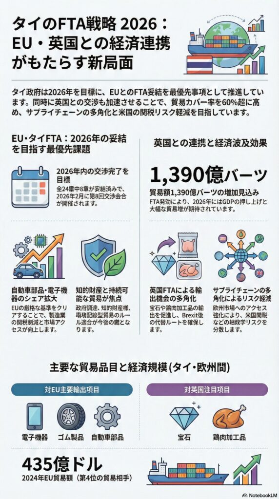 これらFTA発効で、タイの対EU輸出が強化され、電子部品や食品加工業に恩恵が及びます。[nationthailand]