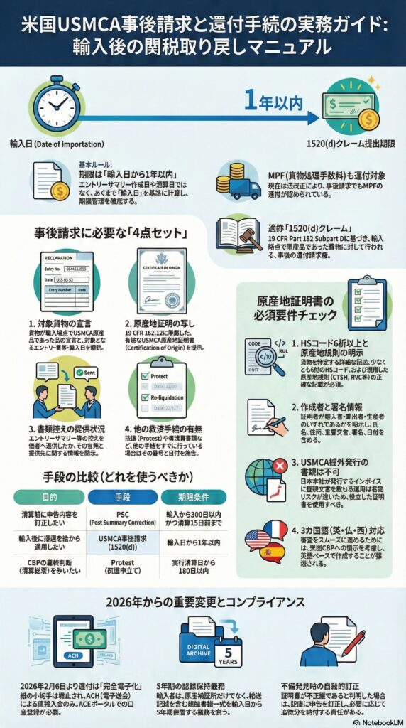 | 輸入時にUSMCA申告し忘れた優遇を後から取り戻したい | USMCA事後請求(1520(d)クレーム) | 輸入日から1年以内law.cornell+1 | 清算済み、またはPSC期間を過ぎたが、当初輸入時点で原産性があった場合 |