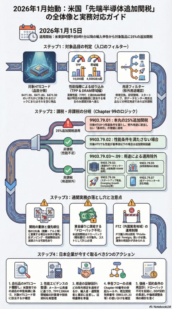 米国は2026年1月15日から、特定仕様の先端半導体などに対して、HTS(米国関税分類)上の新しい追加関税枠を立ち上げました。ポイントは、半導体という広い括りではなく、HTSコードと性能指標で絞り込んだうえで、用途によって課税か非課税かを分ける、という設計になっている点です。(The White House)
