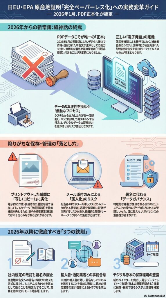 2026年1月、日EU・EPAの運用において、原産地証明の完全な電子化(PDF運用)への移行が改めて確認されました。これは、単に紙を使わなくてもよいという許可ではなく、デジタルデータこそが正本であるというルールの最終確定を意味します。