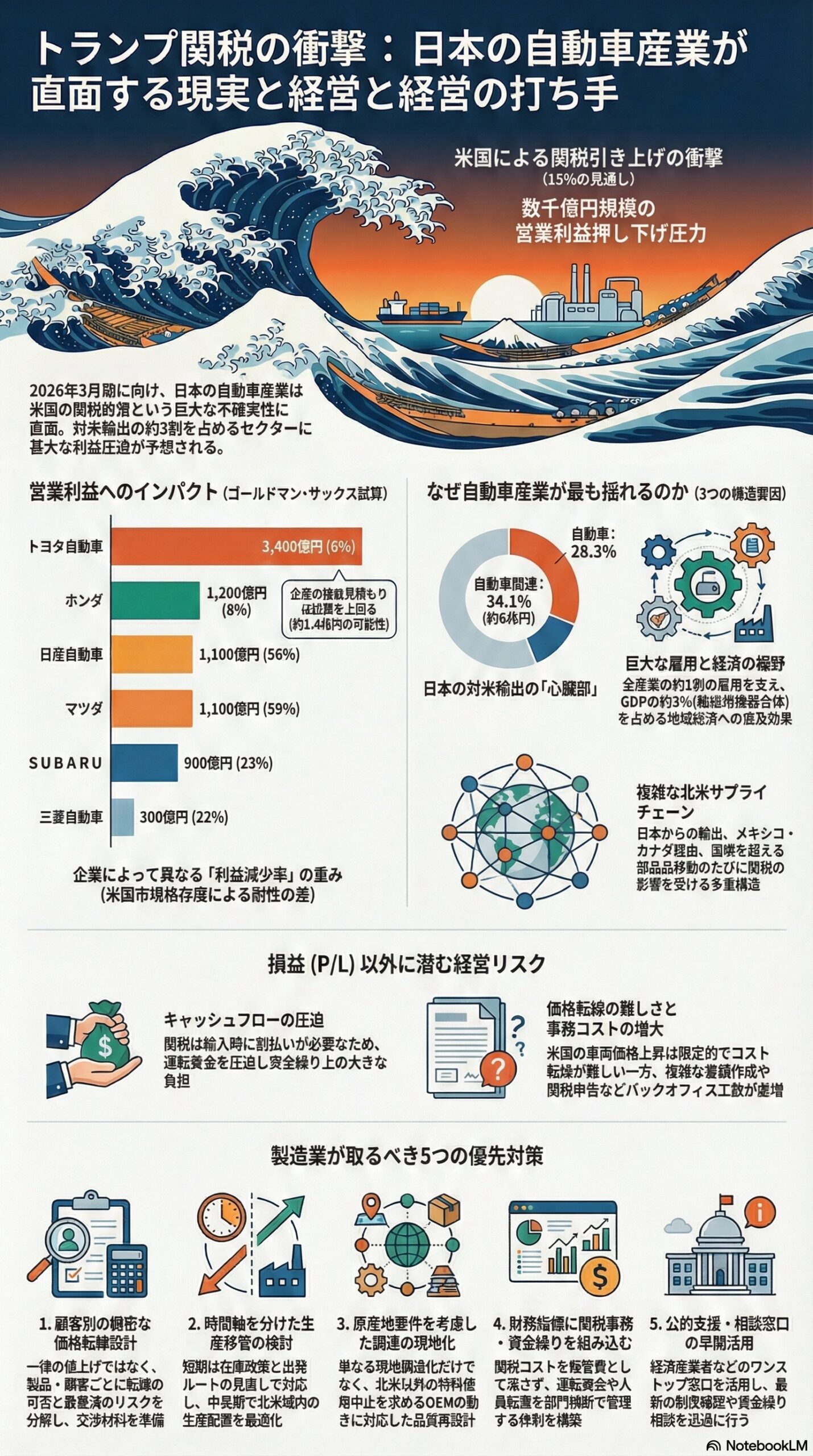 ただし重要なのは、数字を眺めるだけでは本質が見えない点です。関税は「輸出のコスト増」であると同時に、「需要の価格弾力性」「北米のサプライチェーン構造」「事務負担とキャッシュフロー」まで含めた経営課題として現れます。本稿では、ゴールドマン試算を出発点に、ビジネスパーソンが押さえるべき論点を深掘りします。