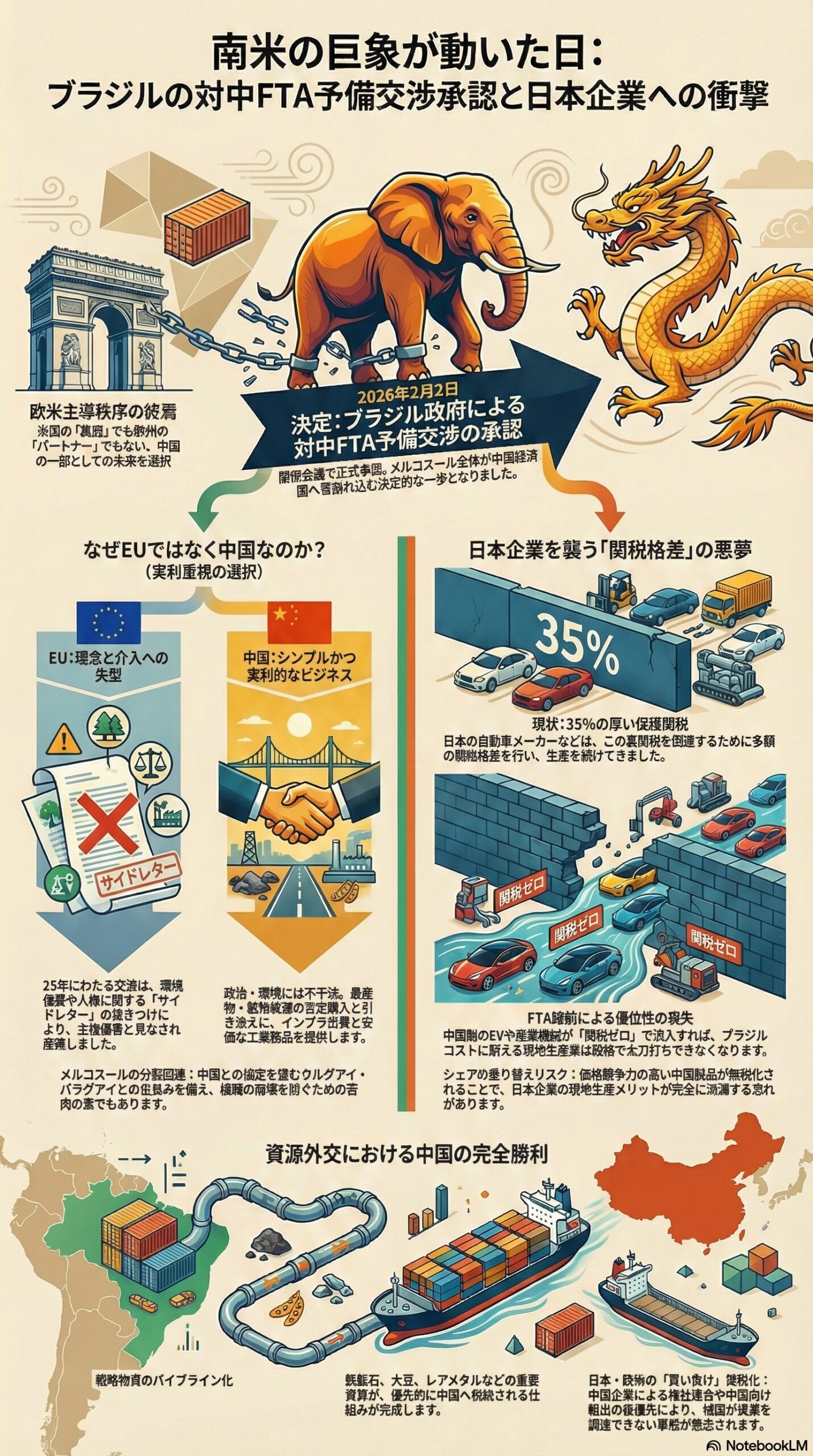 2026年2月2日のブラジルによる予備交渉承認は、南米が米国の裏庭でも欧州のパートナーでもなく、中国経済圏の一部となる未来を選択した歴史的な分岐点です。