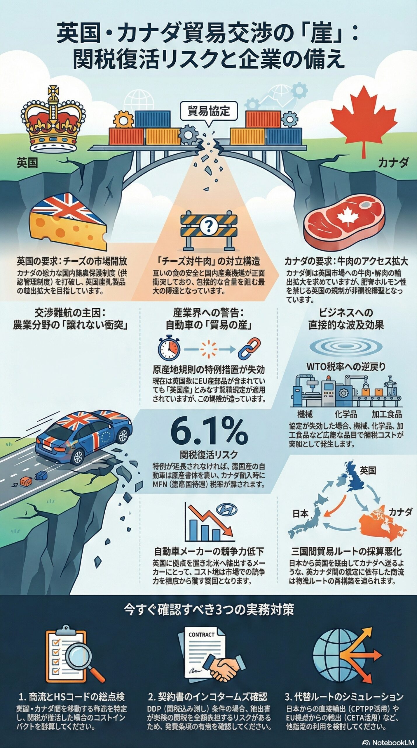 英国とカナダのFTA交渉難航は、主要国同士であっても保護主義的な対立によって自由貿易が後退し得るという現実を突きつけています。