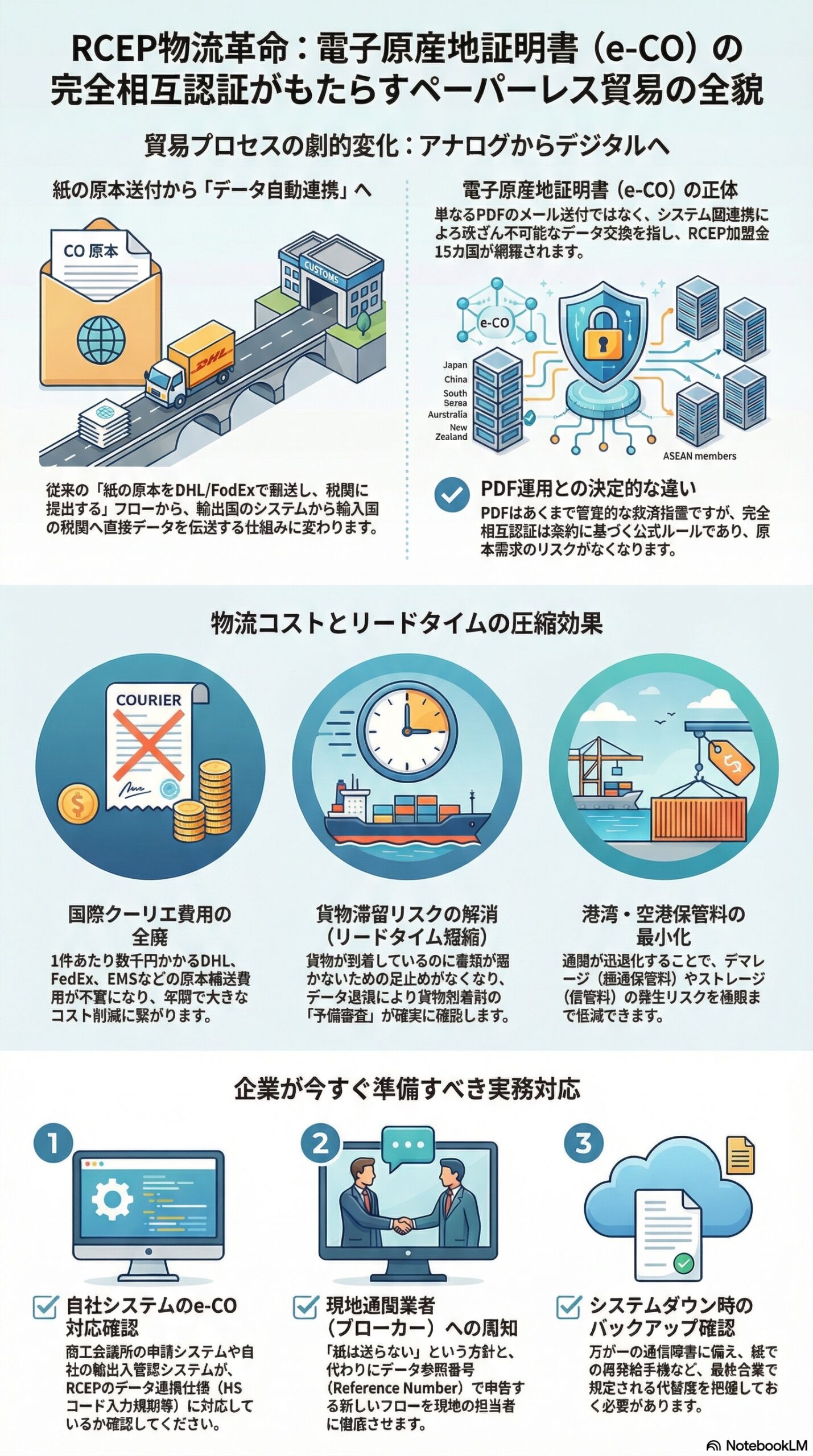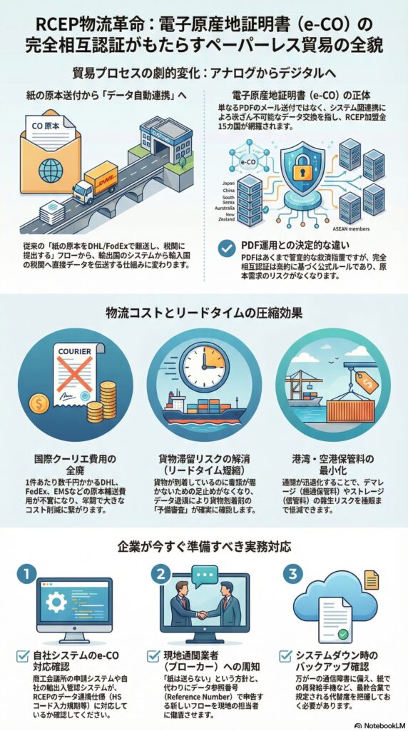 物理的な書類の移動というボトルネックが解消されることで、RCEPという巨大な自由貿易圏のポテンシャルが最大限に発揮されます。紙を使わない、データで走る高速な物流体制を構築できた企業こそが、この新しい貿易環境で勝利することになるでしょう。