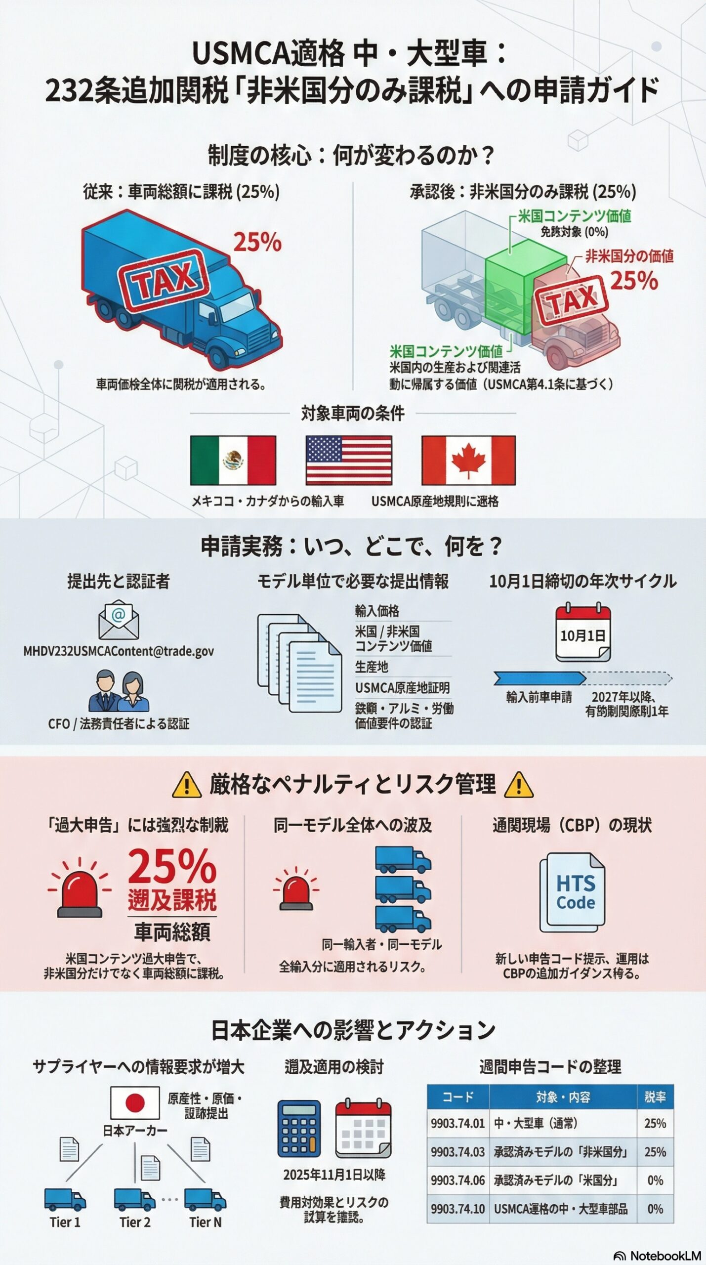 中・大型車(MHDV: Medium- and Heavy-Duty Vehicles)の米国向け輸入では、USMCAの原産地規則を満たしていても、232条に基づく追加関税(原則25%)の論点が残ります。