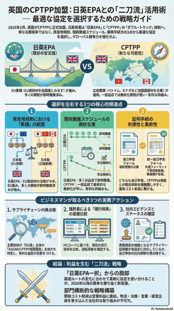 英国のCPTPP加盟により、日本企業は強力な武器を二つ手に入れました。これまでは「日英EPA一択」だった思考を切り替え、調達ルートの変化に合わせて柔軟に協定を使い分けることが、2026年以降のグローバル競争を勝ち抜くための新常識となります。