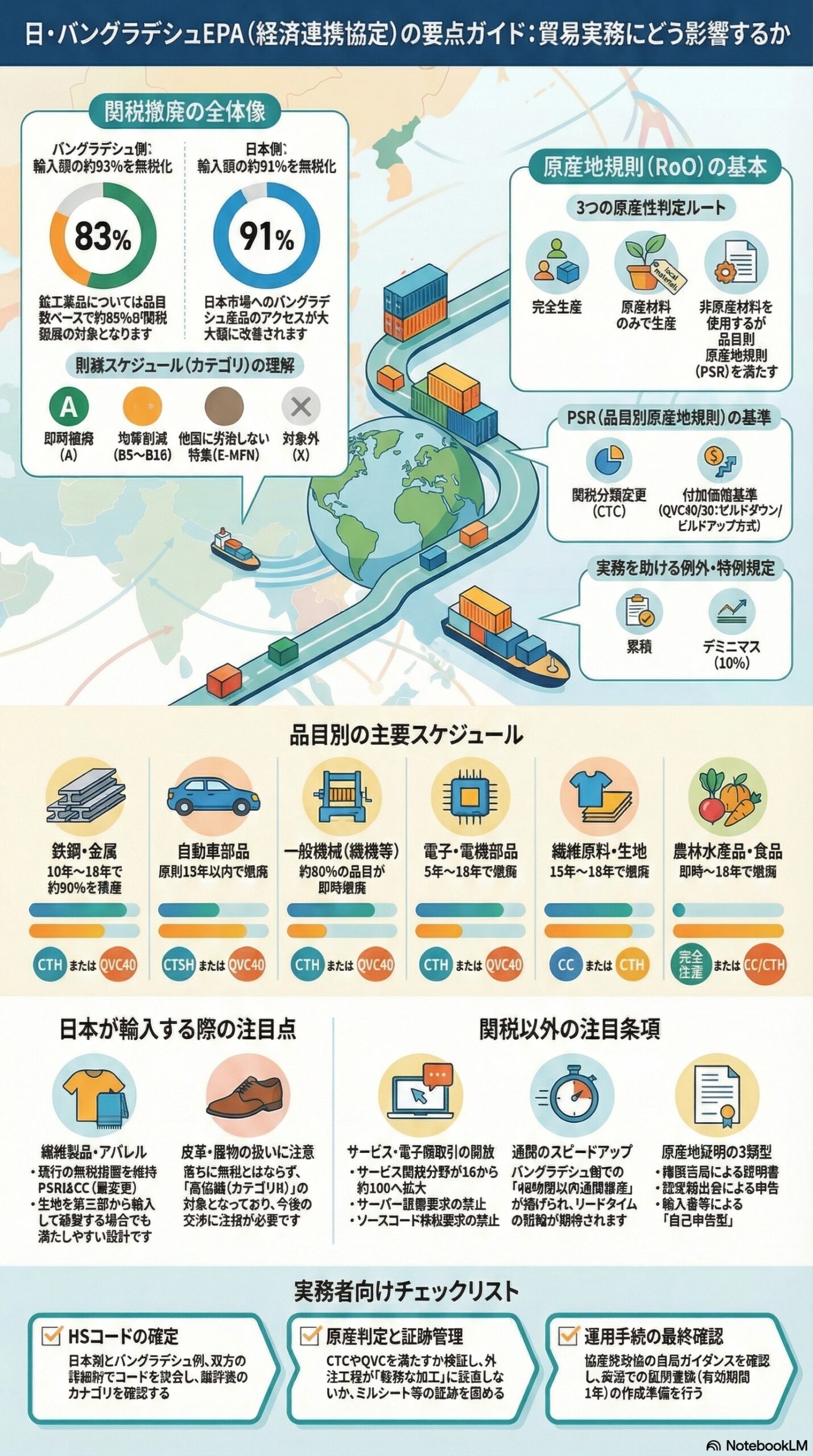 本稿は、貿易実務に直結する「関税が無税になる割合」「商品カテゴリーごとの原産地規則と関税削減スケジュール」「対象外品目」「関税以外の注目条項」を、公式資料と協定本文に基づいてまとめます。(外務省)