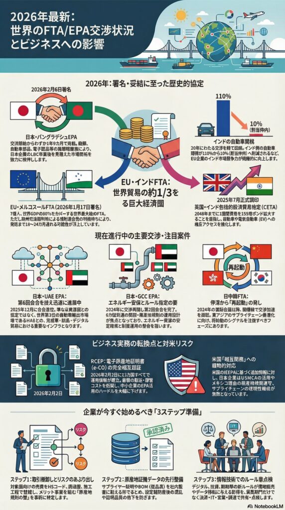 2026年2月時点において、世界のFTA/EPA交渉は活発な動きを見せています。署名済みまたは発効間近の協定としては、日本・バングラデシュEPA、EU・インドFTA、英国・インドFTA、EU・メルコスールFTAが挙げられます。交渉中の案件では、日本・UAE EPA、日本・GCC EPA、日中韓FTAが重要な進展を見せています。meti+4
