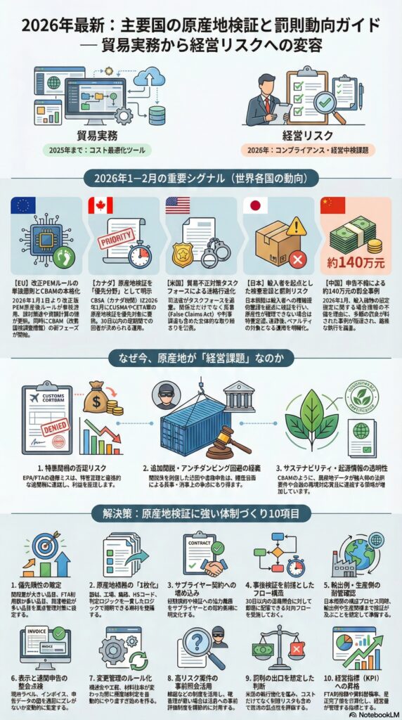 本稿は、2026年2月9日時点で公表されている一次情報を中心に、2026年1–2月に日本企業が優先して追うべき「主要国の原産地検証と罰則動向」を整理し、すぐに社内の稟議や体制整備に落とし込める観点で深掘りします。