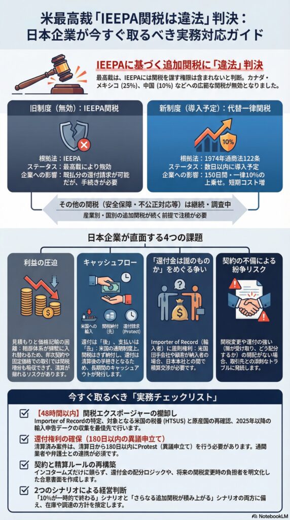 - 日本企業にとっての焦点は、関税コストの再計算、契約上の負担者と還付の帰属、そして通関データにもとづく返金権利の確保です。(Reuters)