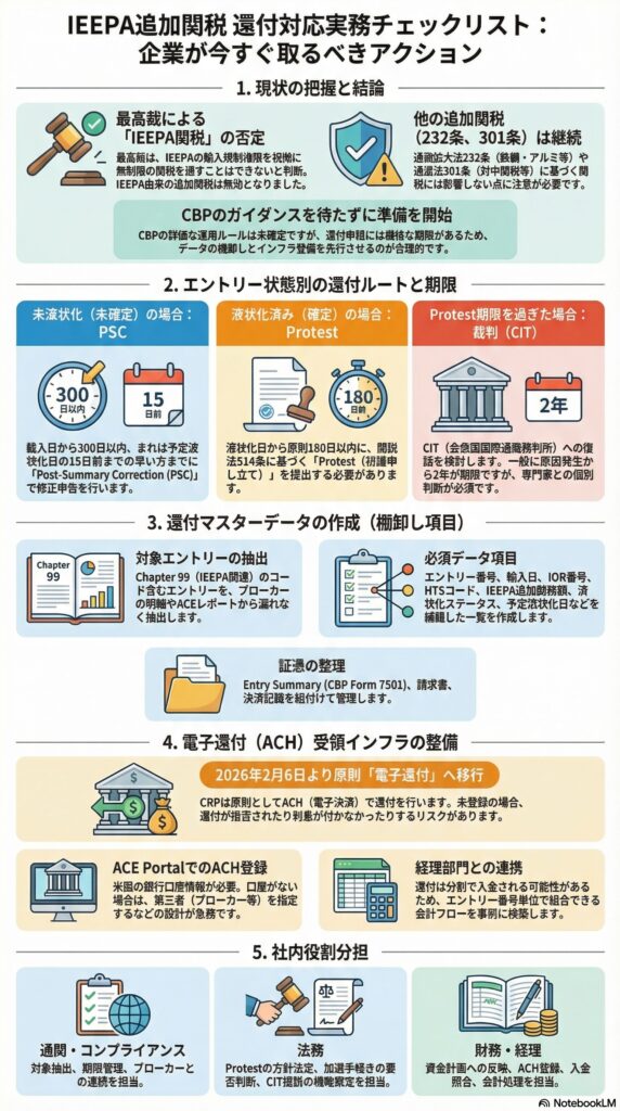 つまり「徴収停止の方向性」は出たものの、「過去に支払った分がどう返るか」は、企業側の手続対応とCBPの実務運用に左右される局面です。ここでは、ビジネスパーソンが社内で即実装できる形に落とした、CBP還付対応の深掘りチェックリストをまとめます。