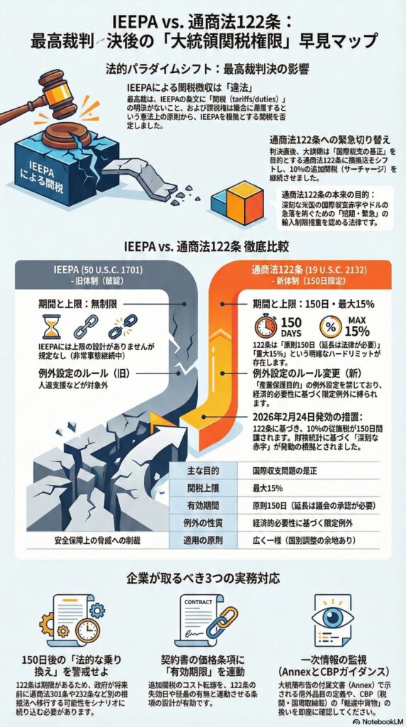 この表は、IEEPAの条文(1701、1702)と例外規定、通商法122条の条文構造(150日、15%、広く一様、限定例外、関税として扱う)および2026年2月の最高裁判決と布告文に基づいています。 (Legal Information Institute)