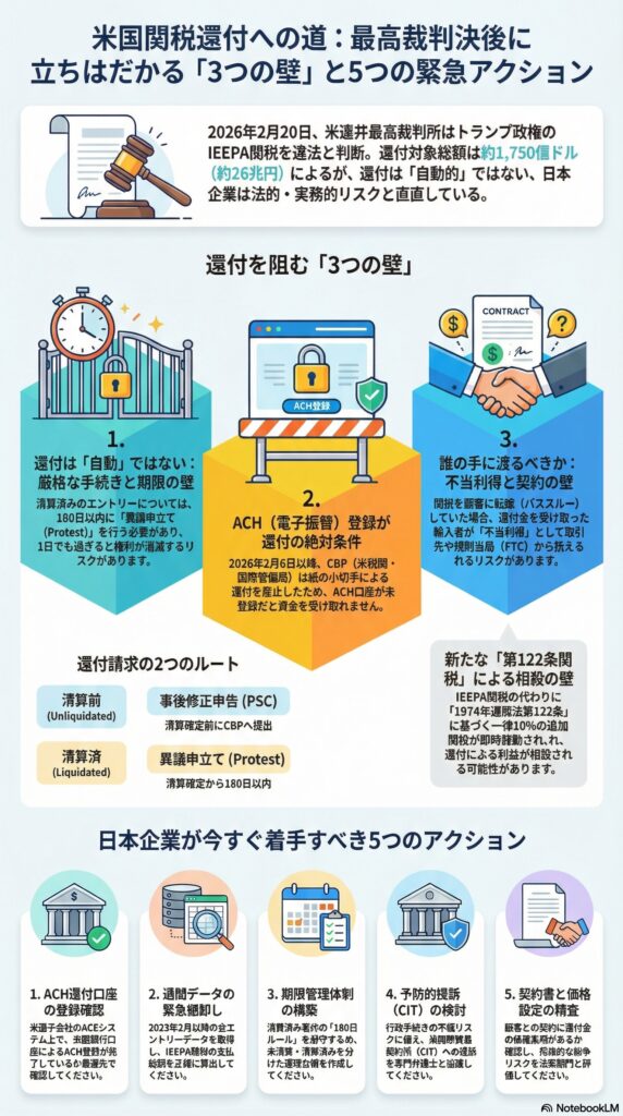 最高裁が違法と判断しても、企業の銀行口座に自動的にお金が振り込まれるわけではありません。還付を受けるためには、関税を支払った輸入者(Importer of Record)が自ら厳格な手続きを踏む必要があります。