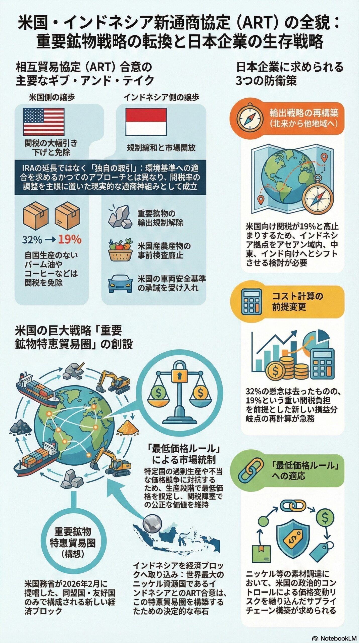 米国とインドネシアの相互貿易協定(ART)合意は、関税という強力な武器を用いた米国の通商戦略が、東南アジアにおいても本格的に機能し始めたことを象徴しています。