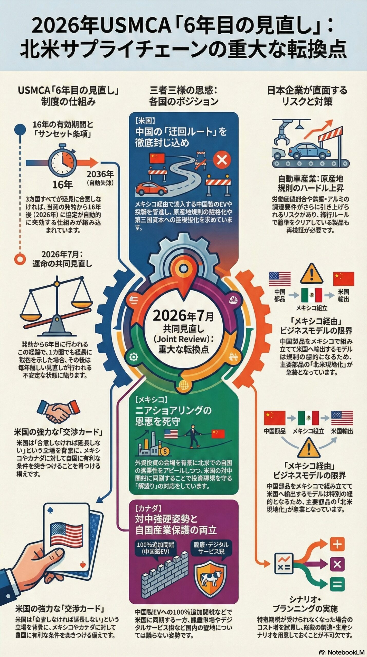 2026年7月に予定されているUSMCA(米国・メキシコ・カナダ協定)の「6年目の見直し」に向けて、関係各国の水面下での駆け引きが本格化しています。