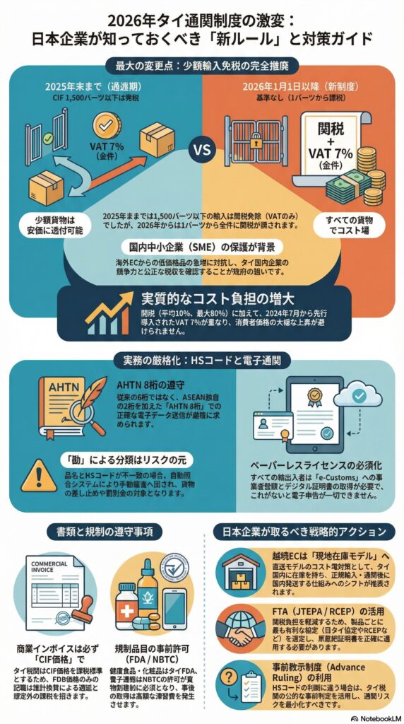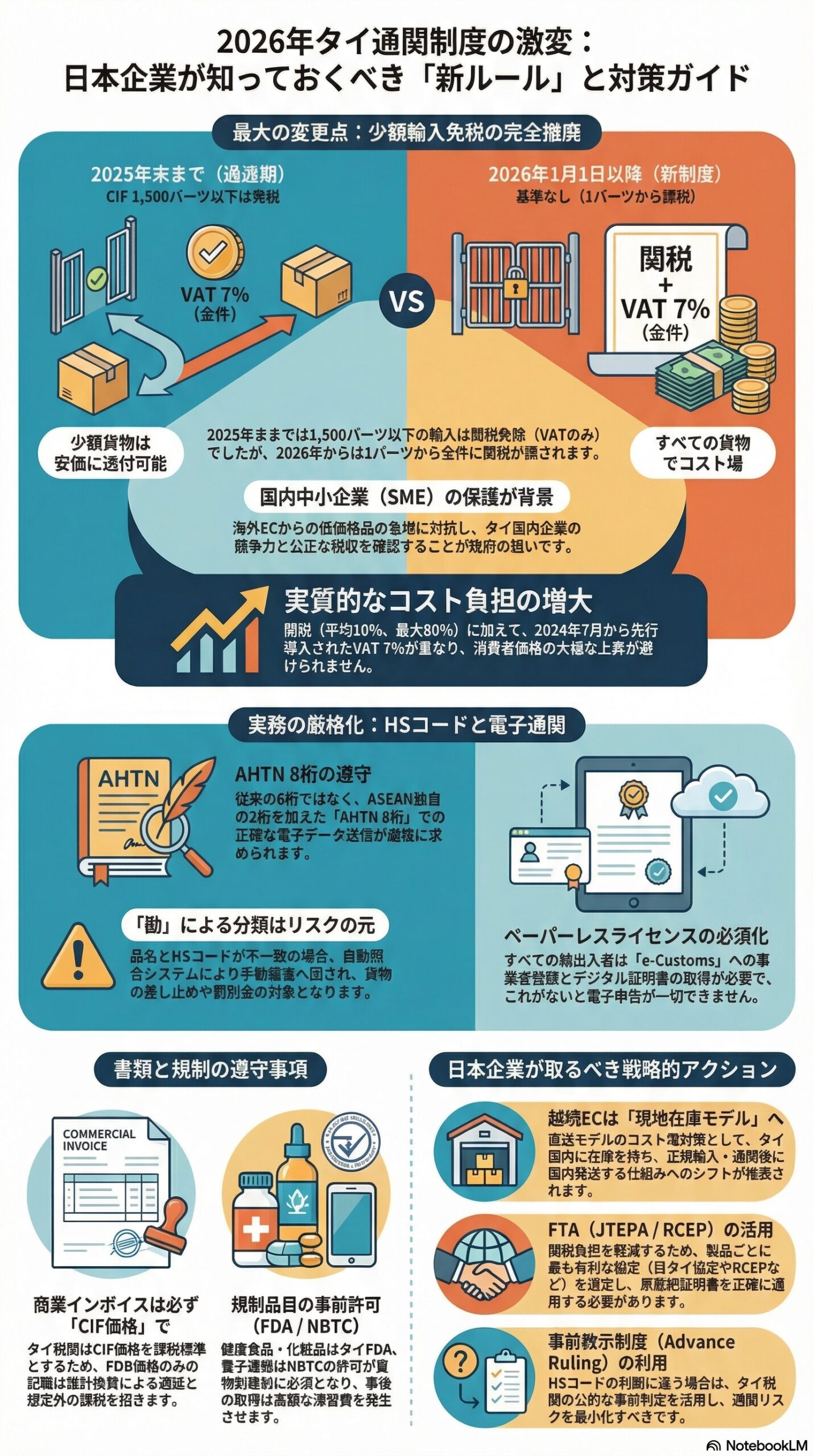本ガイドは、タイとのビジネスに携わるすべての日本人ビジネスパーソンを対象に、2026年の通関変更の全体像を正確かつ実務的に解説する。