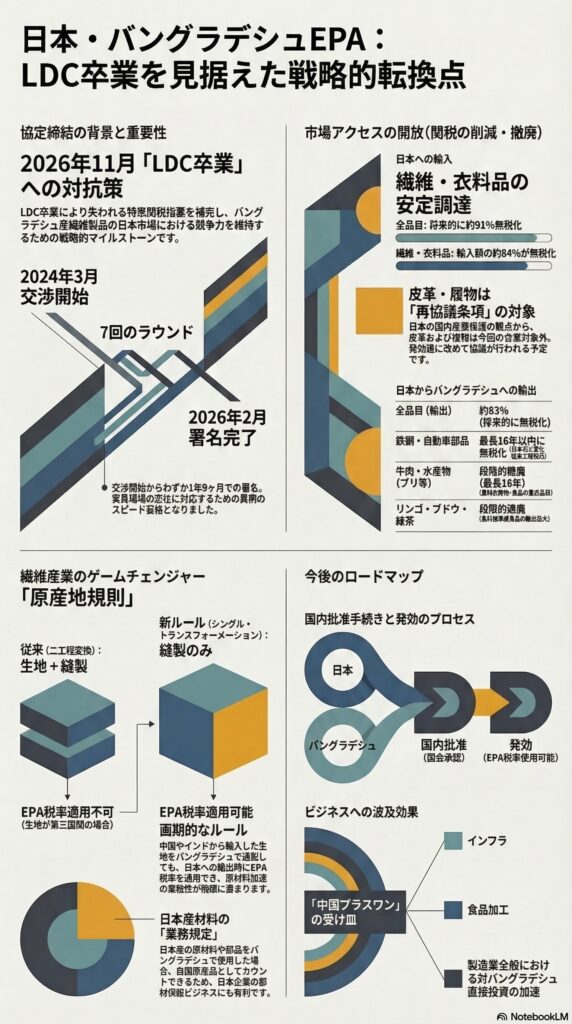 日本のアパレル・繊維企業にとっては、LDC卒業後の関税急増リスクが本EPAによって緩和されます。特にシングル・トランスフォーメーション・ルールの採用により、バングラデシュからの衣料品調達ルートを維持・拡大できる見通しです。