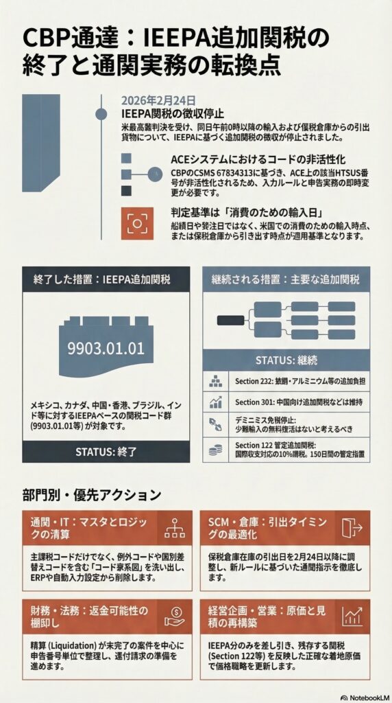 - 今回の通知の本質は、IEEPA関税の徴収終了とACEの入力ルール変更が同時に起きたことです。