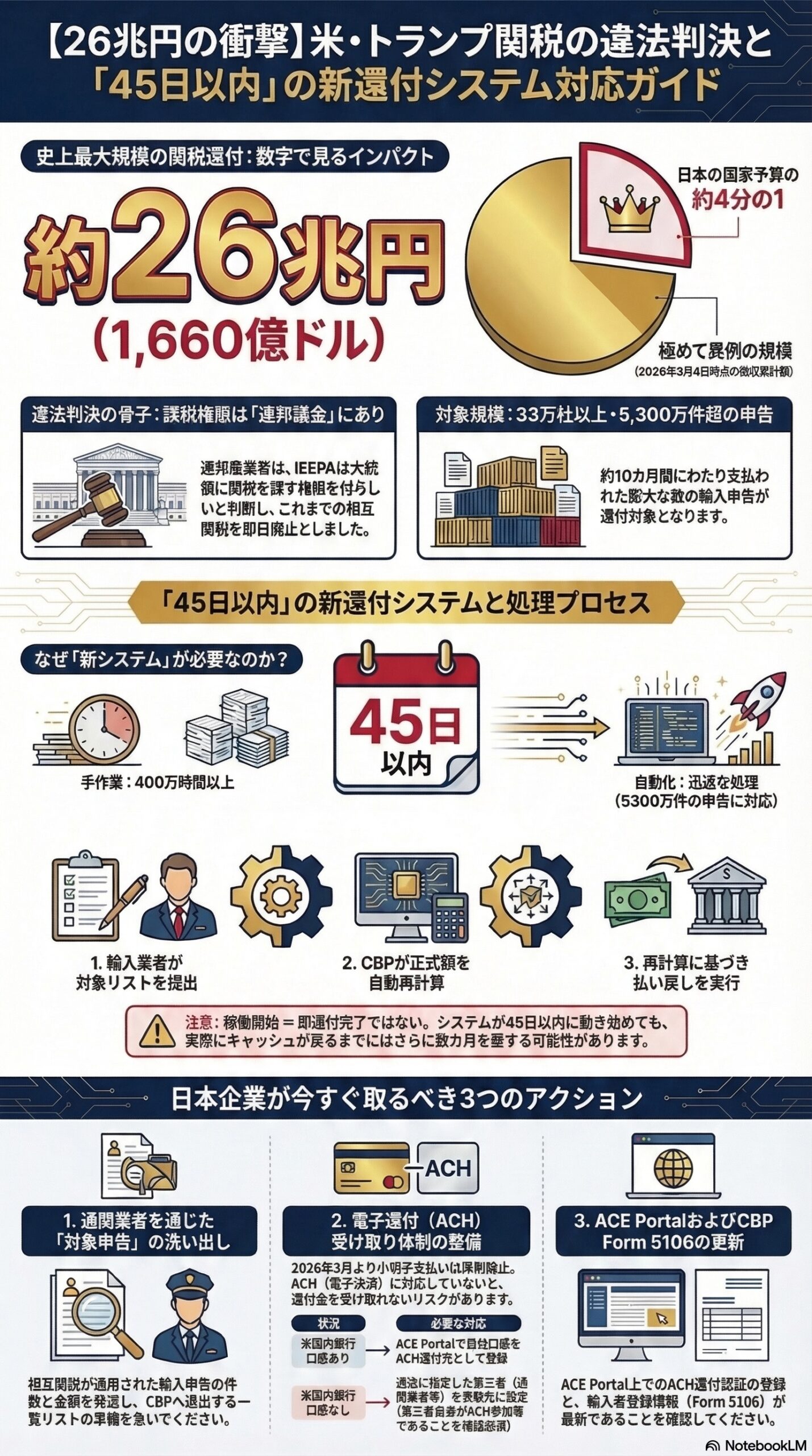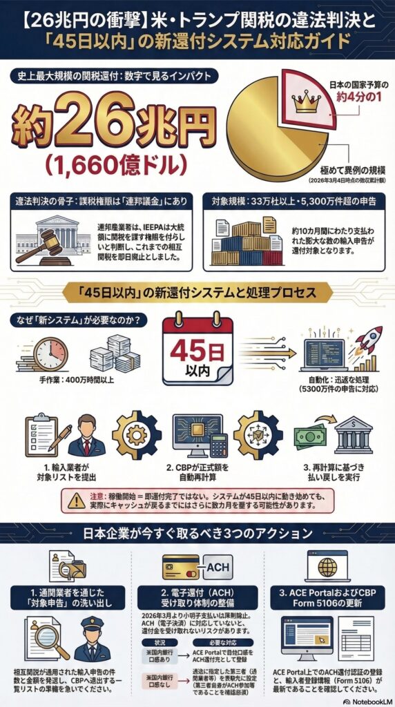 まず、2026年2月20日に連邦最高裁がIEEPAに基づくトランプ関税を違法と判断しました。 これを受け、3月4日に国際貿易裁判所がCBPに還付措置を命令しました。 そして3月6日、CBPが「45日以内に新システムを稼働させる」と表明し、徴収済みの約26兆円が返還プロセスに乗り始めました。pwc+2