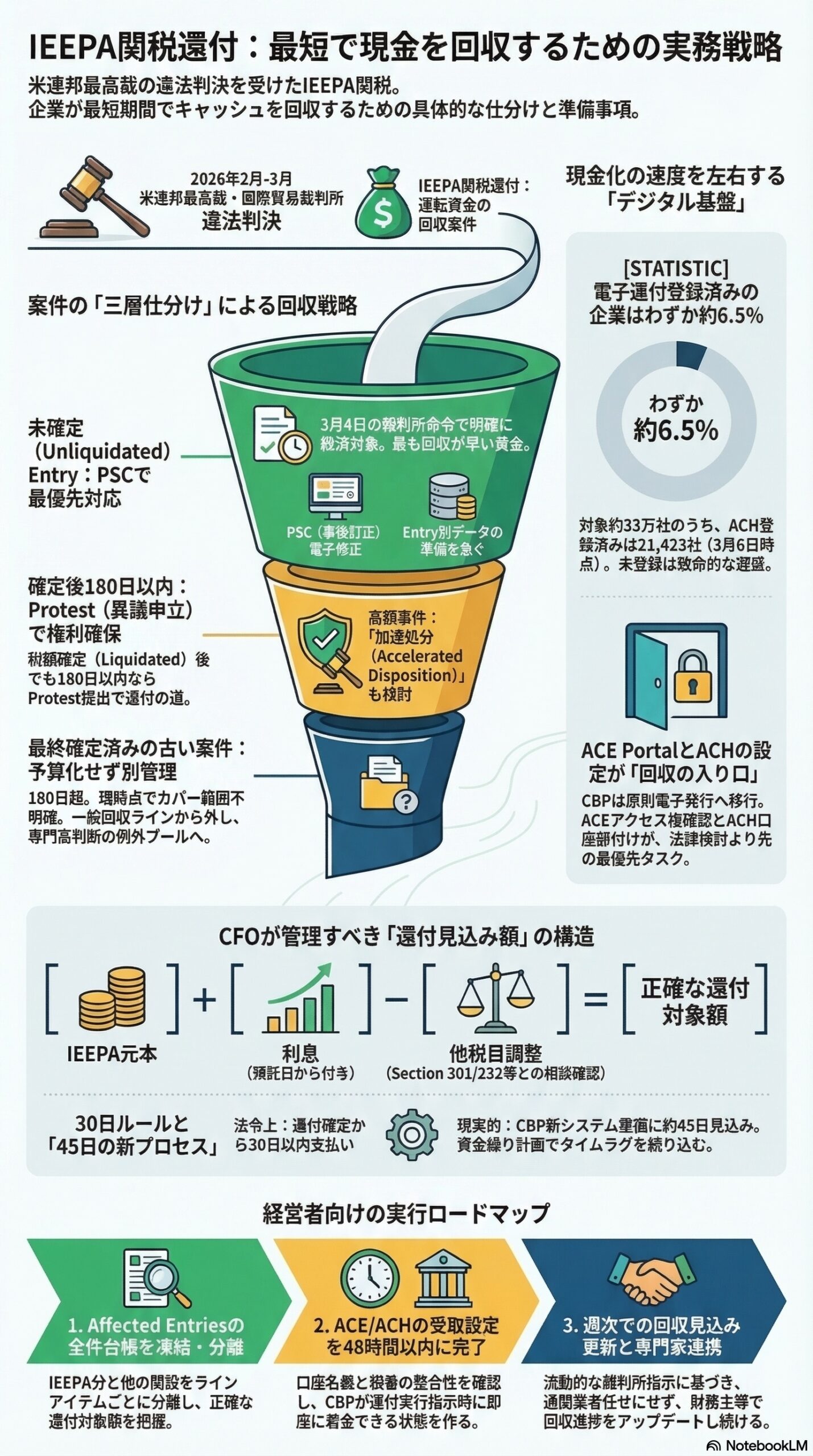 経営者が今日決めるべき順番は明快です。第一に、affected entries の全件台帳を凍結し、IEEPA と Section 122、Section 232、Section 301 などを line item で分離する。第二に、未確定案件と180日内案件を48時間以内に仕分けする。第三に、ACE と ACH の受取設定を完了する。第四に、高額案件だけ counsel 付きで protest と accelerated disposition の要否を判定する。第五に、元本と利息の回収見込みを週次で更新する。これを broker 任せの点の作業ではなく、財務主導の線の作業に変えた会社から先に回収が始まります。