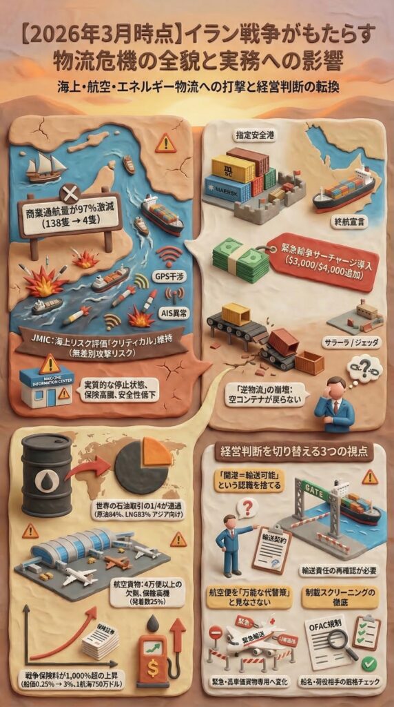 2026年3月10日時点で、イラン戦争の影響を最も強く受けている物流は、ホルムズ海峡経由の海上物流、湾岸向けコンテナネットワーク、湾岸ハブ依存の航空物流、そしてそれらに付随する保険と制裁実務です。港が開いていることは安心材料にならず、通常ルートと通常契約が維持できることが本当の指標になっています。経営の現場では、中東案件を「通常運賃の延長線」で扱うのをやめ、「契約到達地の変化」「責任移転」「設備回転」「燃料と保険の同時上昇」を一つの経営課題として管理することが、いま必要です。