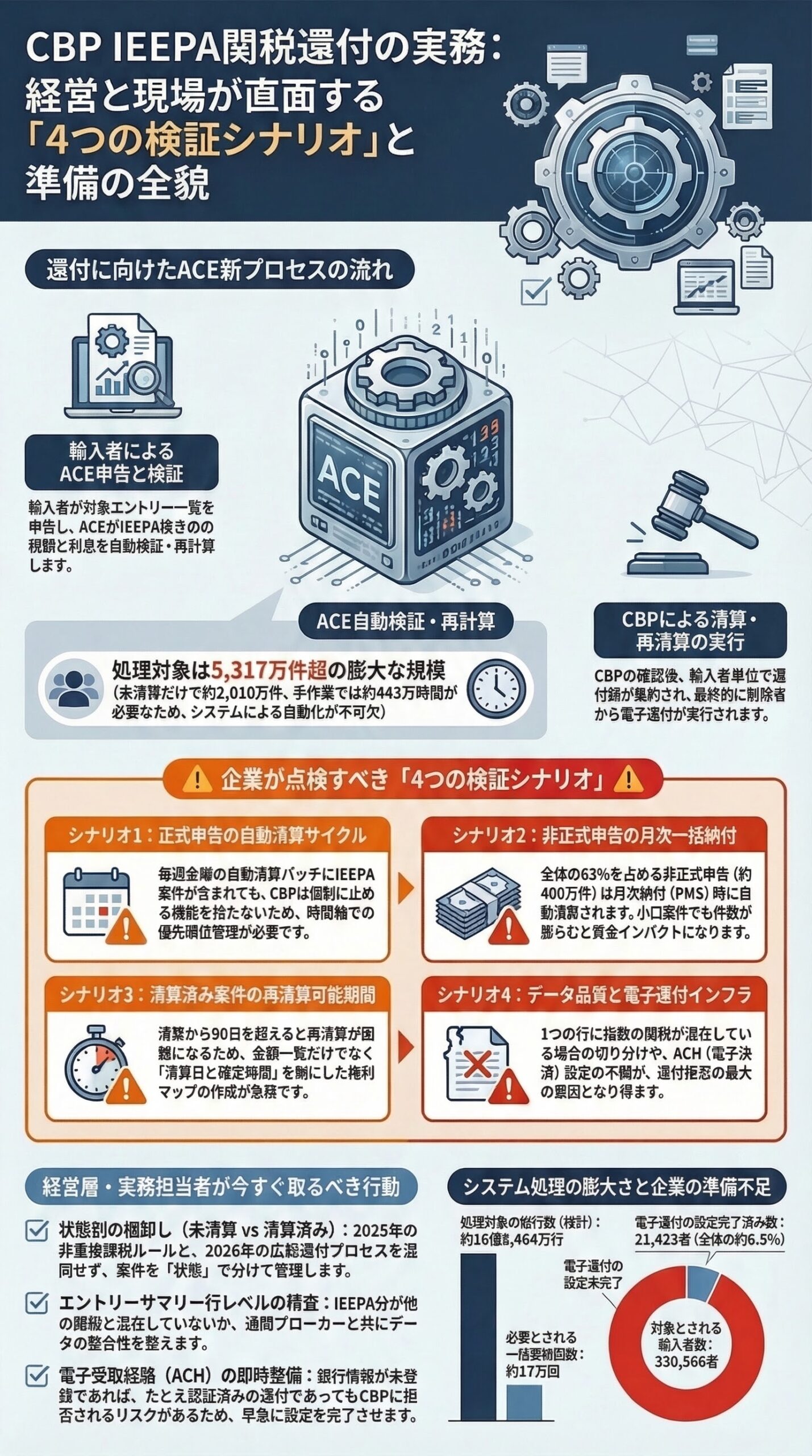 今回のCBP IEEPA還付を、単なる関税が戻ってくる話と見るのは危険です。実際には、ACEを使った大規模な再計算、再清算、利息付与、電子還付の統合作業であり、今後は運用面、法務面、技術面の事情で細部が修正される可能性があります。