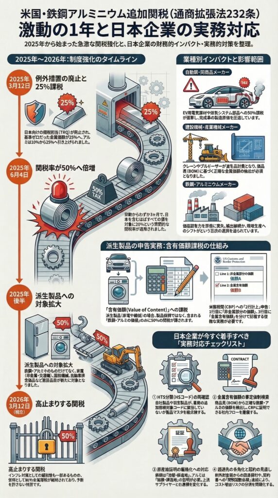 本日2026年3月12日は、ある重大な政策転換からちょうど1年が経過した日にあたります。2025年3月12日、米国の現政権は通商拡張法第232条(Section 232)に基づき、すべての国からの鉄鋼・アルミニウム輸入品に対して一律25パーセントの追加関税を発動しました。