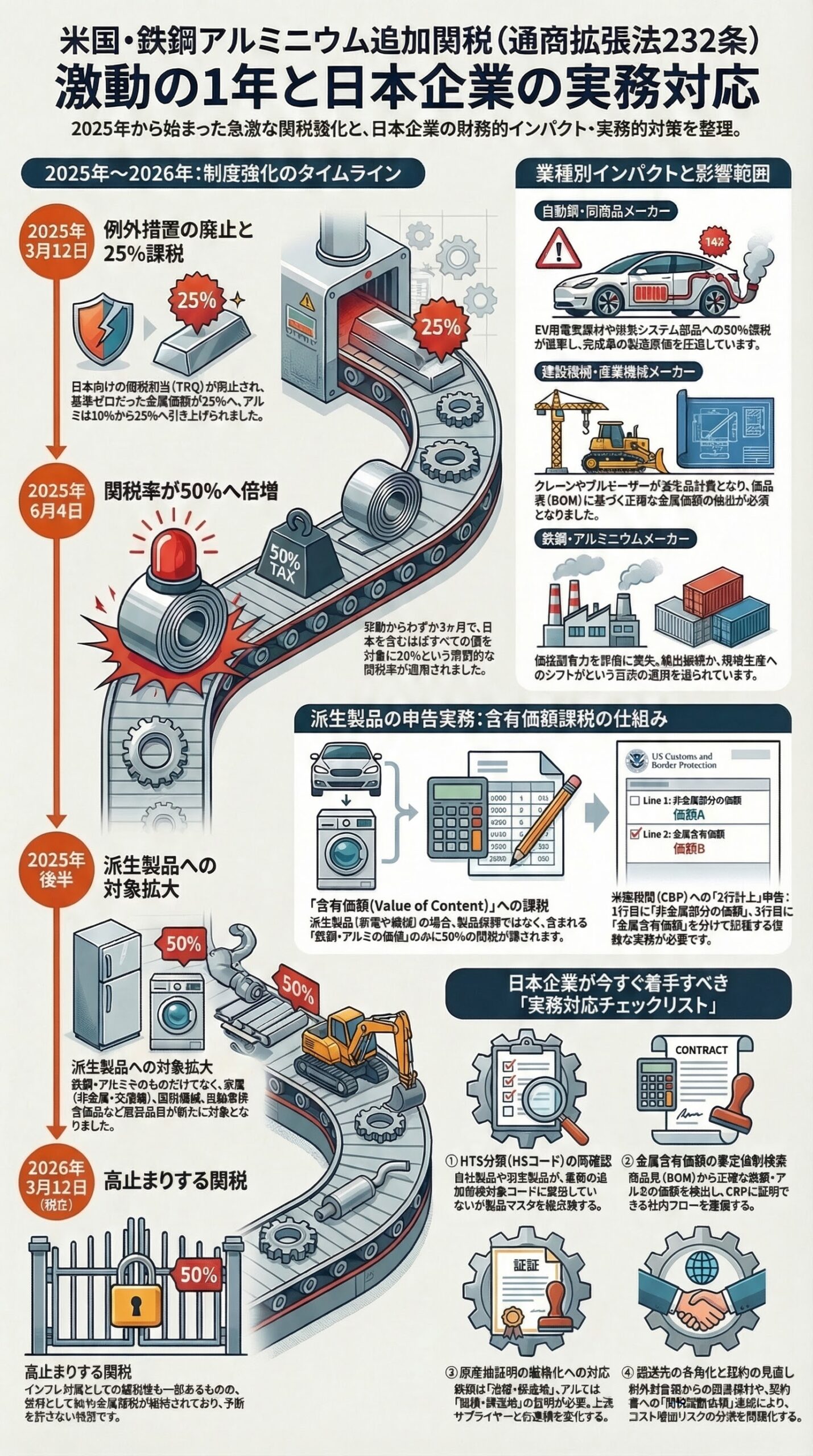 - 原産地証明の厳格化への対応: 鉄鋼は「溶解・鋳造(Melt and Pour)された国」、アルミニウムは「製錬・鋳造(Smelt and Cast)された国」が原産国とみなされます。単なる加工国ではなく、上流のサプライヤーからの正確な証明書取得が必要です。