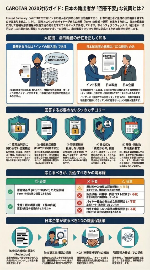 **必要なこの問いは実務上非常に重要なポイントを突いています。CAROTAR 2020の法的義務主体はインド輸入者であり、日本輸出者には同規則上の直接的な法的義務はありません。 そのため「応じる必要がない質問」と「応じることが推奨される質問」を明確に切り分けることが、日本企業のリスク管理の核心です。elplaw+1