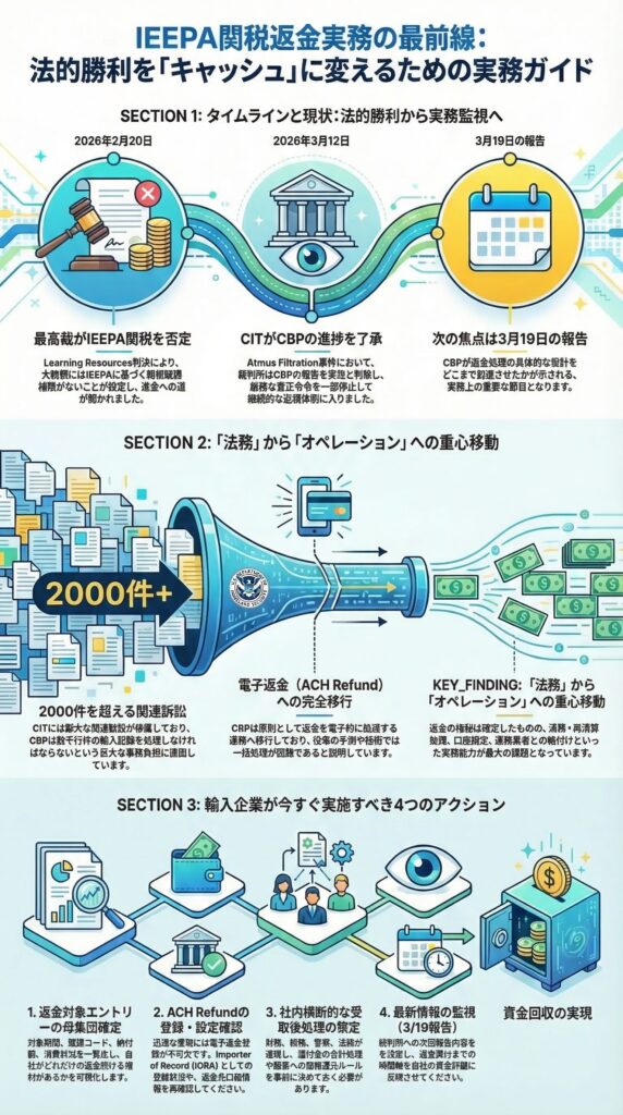 本記事は2026年3月14日時点で確認できた公開情報に基づく一般的な情報提供を目的とするものであり、法的助言、税務助言、会計助言、通関実務上の最終判断を提供するものではありません。実際の返金可否、対象範囲、清算手続、会計処理、契約対応については、最新の裁判所命令、CBP公表資料、通関業者、米国弁護士、税務・会計専門家等にご確認のうえ、個別事情に応じてご判断ください。