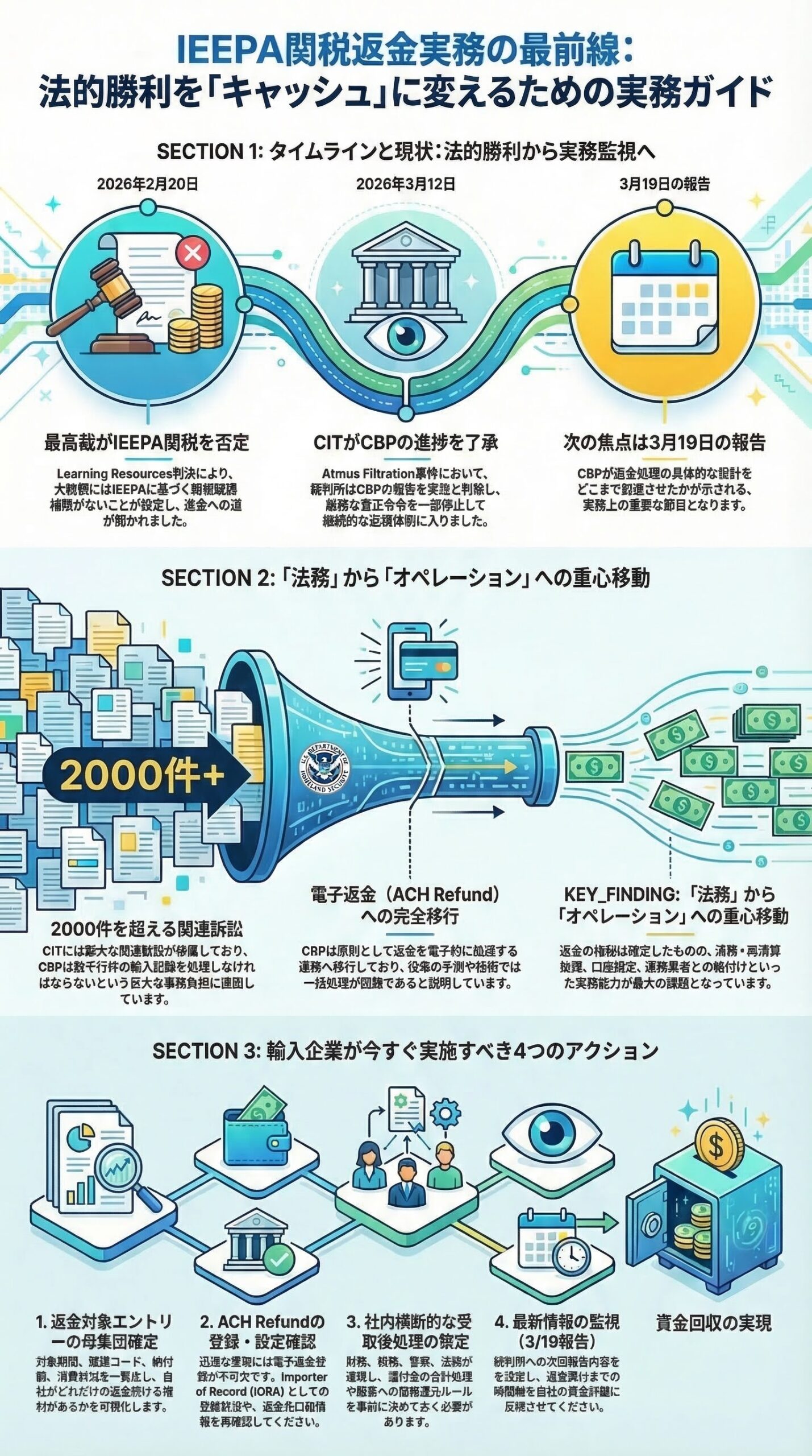 3月19日の次回報告は、CBPがどの程度まで返金処理の設計を前進させたかを示す重要な節目です。ここでACE、電子返金、清算処理の具体性が増せば、企業側の準備項目もさらに明確になります。逆に進捗が鈍ければ、返金実行までの時間軸を保守的に見直す必要があります。 (Quinn Emanuel)
