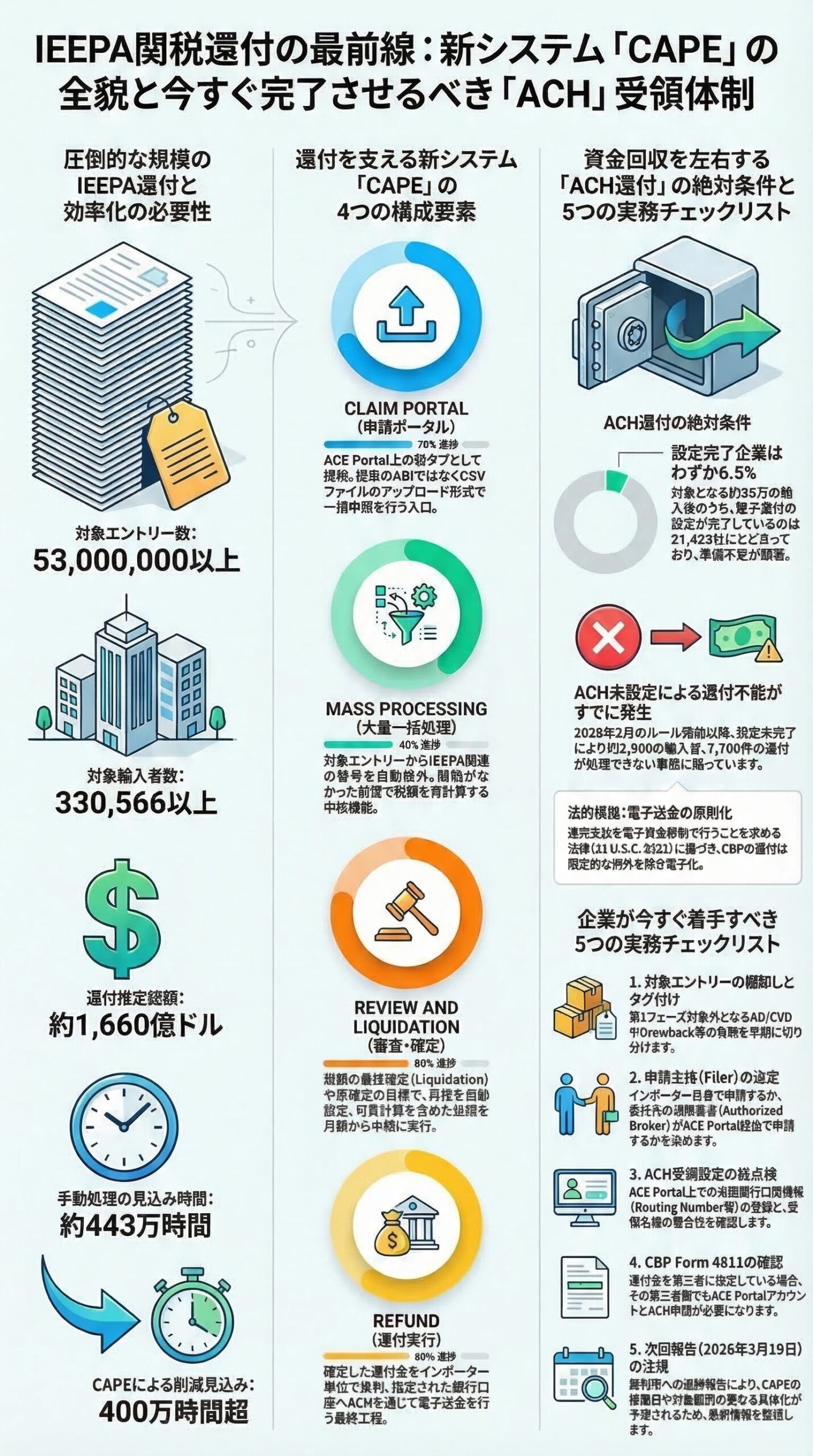 2026年1月2日、CBP は Electronic Refunds の interim final rule を公表しました。2026年2月6日、そのルールが発効し、限定的な例外を除く電子還付が始まりました。2026年3月6日、CBP は既存 ACE では大規模 IEEPA 還付に対応しにくいとして、新機能を 45日で整える考えを裁判所へ示しました。2026年3月12日、CBP はその新機能を CAPE と命名し、四つの構成要素と進捗率を報告しました。同日、裁判所は進捗を相当と見て停止を継続し、2026年3月19日までの次回報告を命じました。(Federal Register)