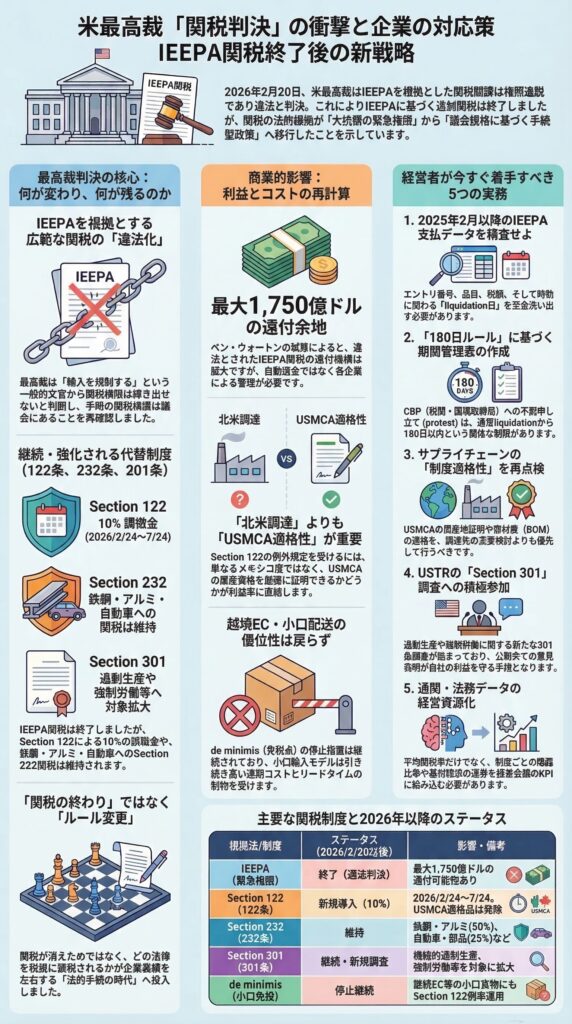 この判決後に経営会議へ上げるべき数字は、単なる平均関税率では足りません。最低でも、2025年2月以降の IEEPA 支払額、entry ごとの liquidation 日、USMCA 適格率、Section 232 と Section 301 の曝露比率、小口郵便や de minimis 前提売上の比率、そして返金請求の進捗を別々に持つべきです。最高裁は、関税授権は本来、明示的な duty 規定と厳格な手続を伴うべきだと述べ、実際に政権側も 122 と 301 に軸足を移しています。つまり、2026年の通商コストは「突然の一本線」ではなく、「複数制度の重なり」をどう管理するかの問題になりました。 (最高裁判所)